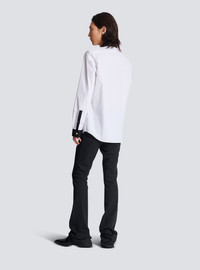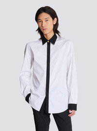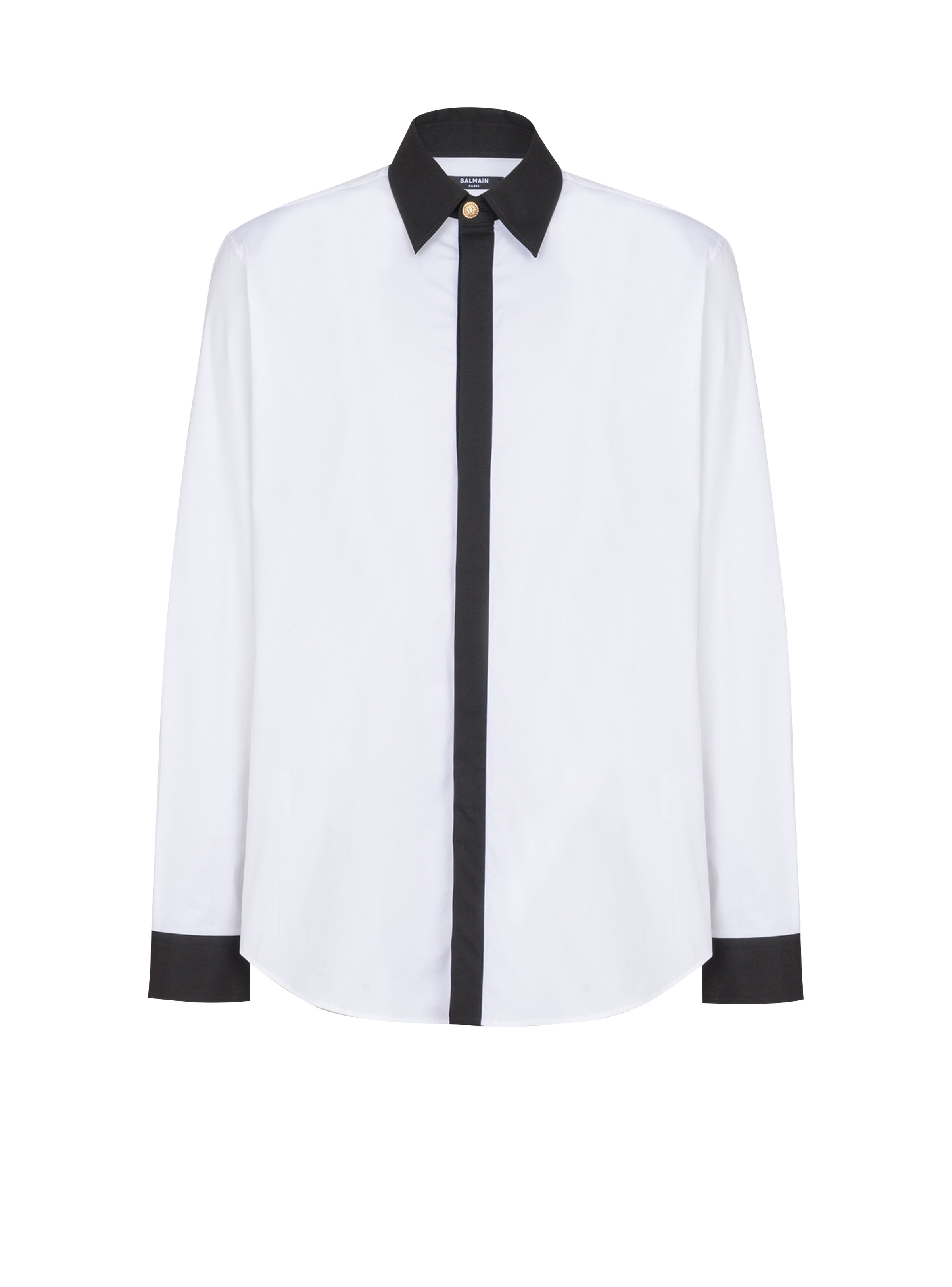 Two-tone poplin shirt - Shirt collar with 1 "Double Chain Lion" button in gold metal - Long sleeves - Straight cuffs with 2 buttons, 1 "Double Chain Lion" button in gold metal - Under-placket fastening with 6 engraved buttons - Contrasting collar, placket and cuffs - Straight cut - Model measures 186cm and wears a size 39 - Main material: 96% cotton 4% elastane - Made in Bulgaria - Item: EH1HS461CF43