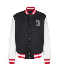 Varsity wool and faux leather jacket - Long contrasting faux leather sleeves - Boucle Varsity patch embroidered on the pocket - 2 slash side pockets - Front fastening with 7 Balmain-engraved press studs - Boucle Balmain patches embroidered on the front - Striped contrasting ribbed edging - Inside pocket with press stud - Satin lining - Classic fit - Model measures 190cm and wears a size 48 - Main material: 100% virgin wool - Made in Moldova - Item: FH1TFA80ME53