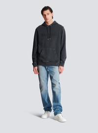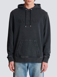 Vintage Balmain embroidered hoodie - Round neckline - Adjustable hood with drawstring - Engraved silver metal aglets and stoppers - Long sleeves - Vintage Balmain logo in tone-on-tone embroidery on the front - Kangaroo pocket - Ribbed trim - Pigment-dyed technique, unique piece - Regular fit - Model measures 190cm and wears a size M - Main material: 100% cotton - Made in Portugal - Item: FH1JT047BC72100% of the cotton fibres used to make this garment are certified and organically farmed