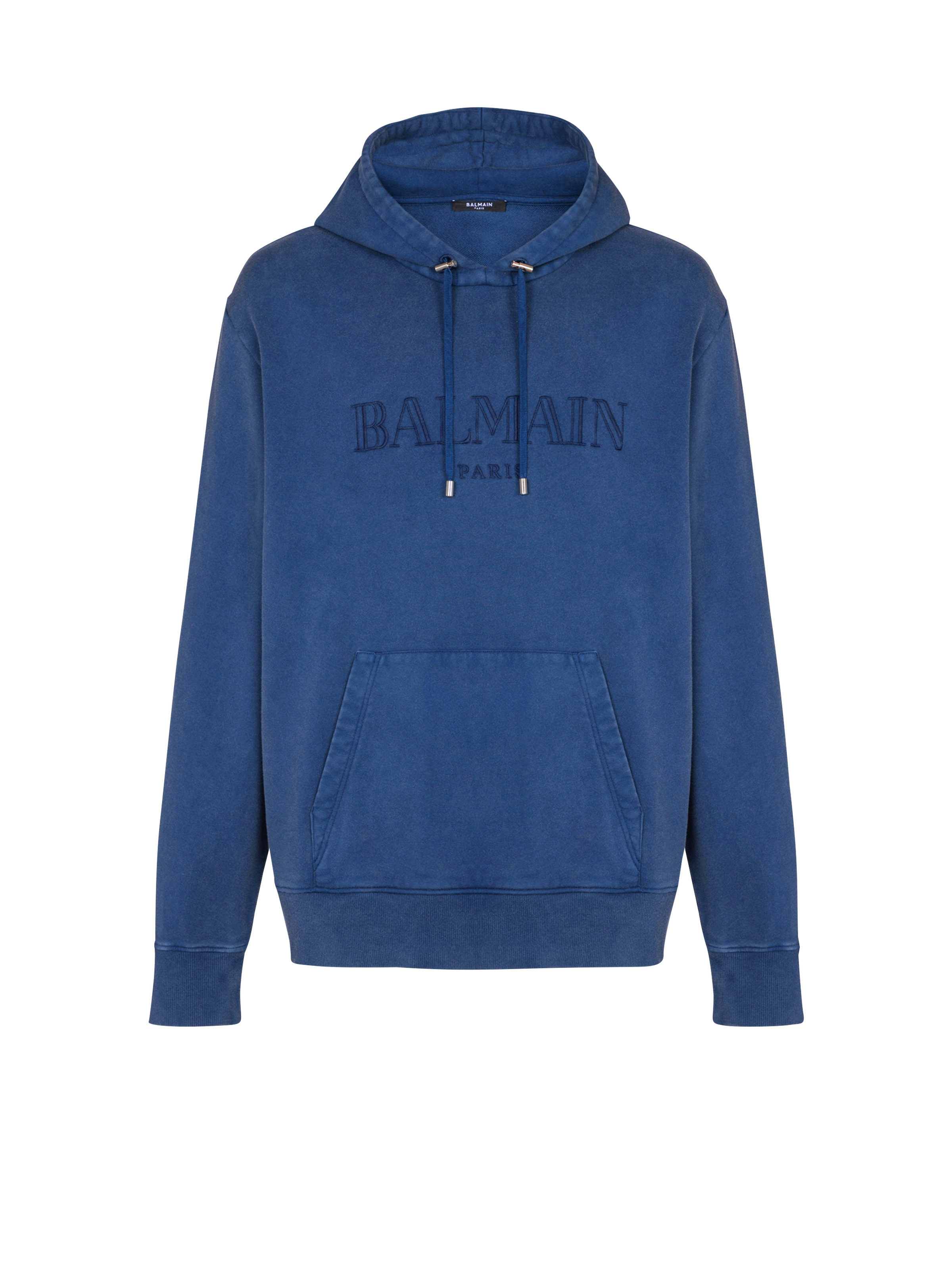 Vintage Balmain embroidered hoodie - Round neckline - Adjustable hood with drawstring - Engraved silver metal aglets and stoppers - Long sleeves - Vintage Balmain logo in tone-on-tone embroidery on the front - Kangaroo pocket - Ribbed trim - Unique, pigment-dyed piece - Regular fit - Model measures 186cm and wears a size M - Main material: 100% cotton - Made in Bulgaria - Item: EH1JT047BC72100% of the cotton fibres used to make this garment are certified and organically farmed