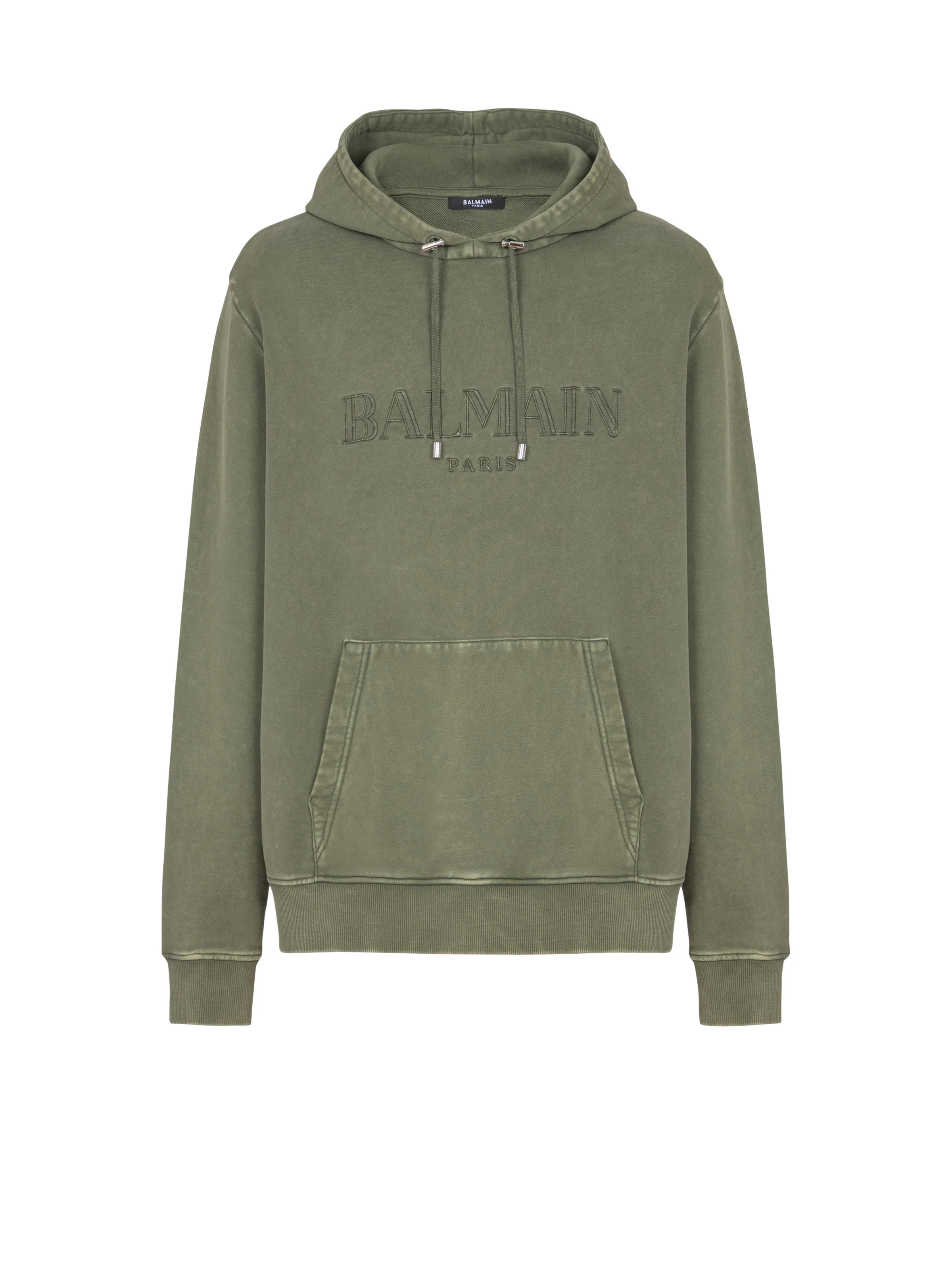 Vintage Balmain embroidered hoodie - Round neckline - Adjustable hood with drawstring - Engraved silver metal aglets and stoppers - Long sleeves - Vintage Balmain logo in tone-on-tone embroidery on the front - Kangaroo pocket - Ribbed trim - Pigment-dyed technique, unique piece - Regular fit - Model measures 190cm and wears a size M - Main material: 100% cotton - Made in Portugal - Item: FH1JT047BC72100% of the cotton fibres used to make this garment are certified and organically farmed
