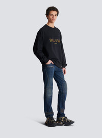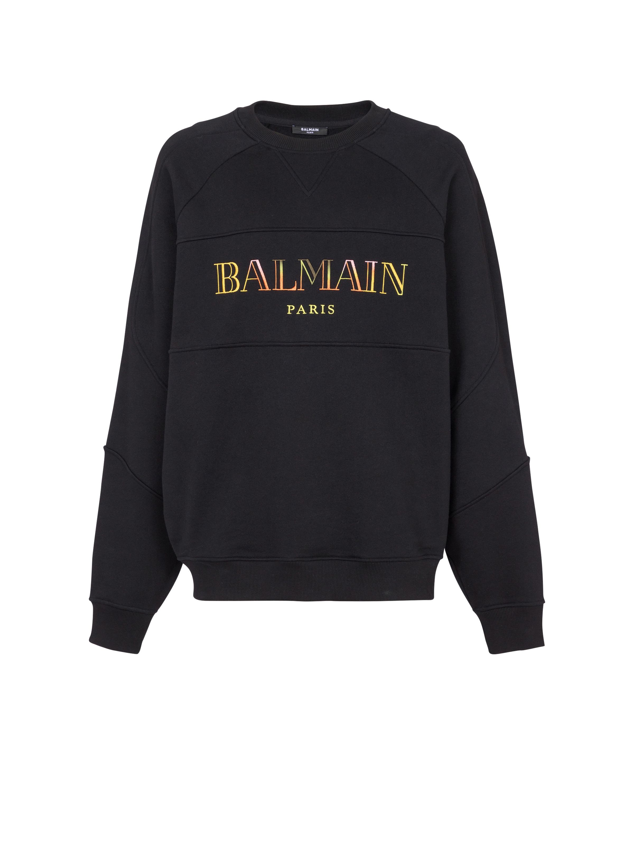 Vintage Balmain embroidered oversized sweatshirt - Relaxed fit - Round neckline - Long sleeves - Rounded panels - Multicoloured vintage Balmain logo embroidered on the front - Ribbed trim - Model measures 189cm and wears a size M - Main material: 100% cotton - Made in Portugal - Item: DH0JS118BC81100% of the cotton fibres used to make this garment are certified and organically farmed