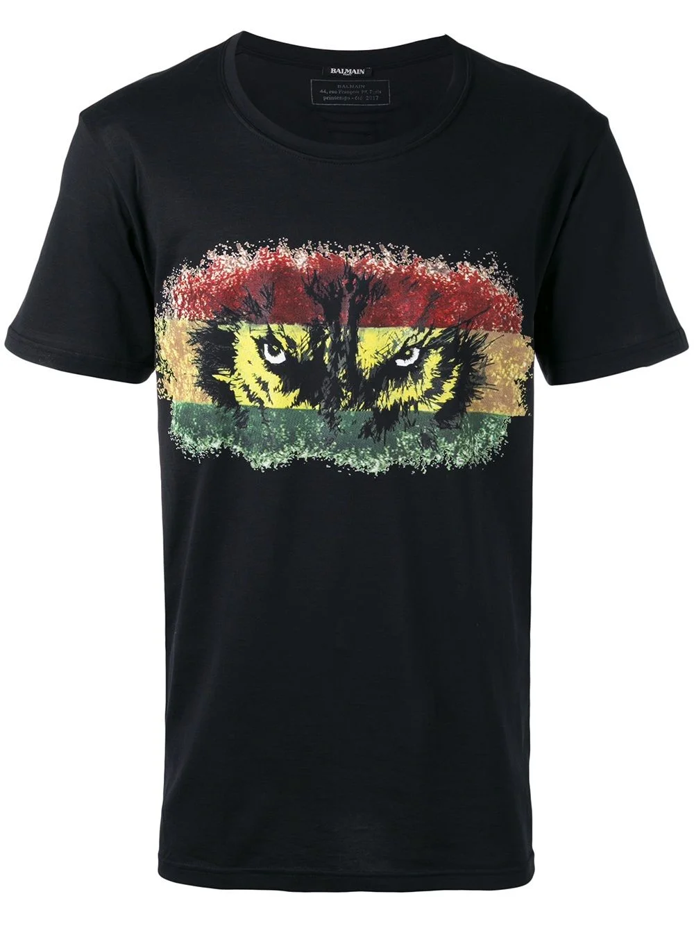 wolf eye T-shirt Olivier Rousteing continues his evolution of Balmain’s classic styles into the brand’s SS17 collection and beyond. Equal amounts decorative, daring and refined, these garments are an elevation of Parisian craftsmanship. This black, green and red cotton wolf eye T-shirt features a round neck, a graphic print, short sleeves, stripes to the chest and a straight hem. Made in France Composition Cotton 100%