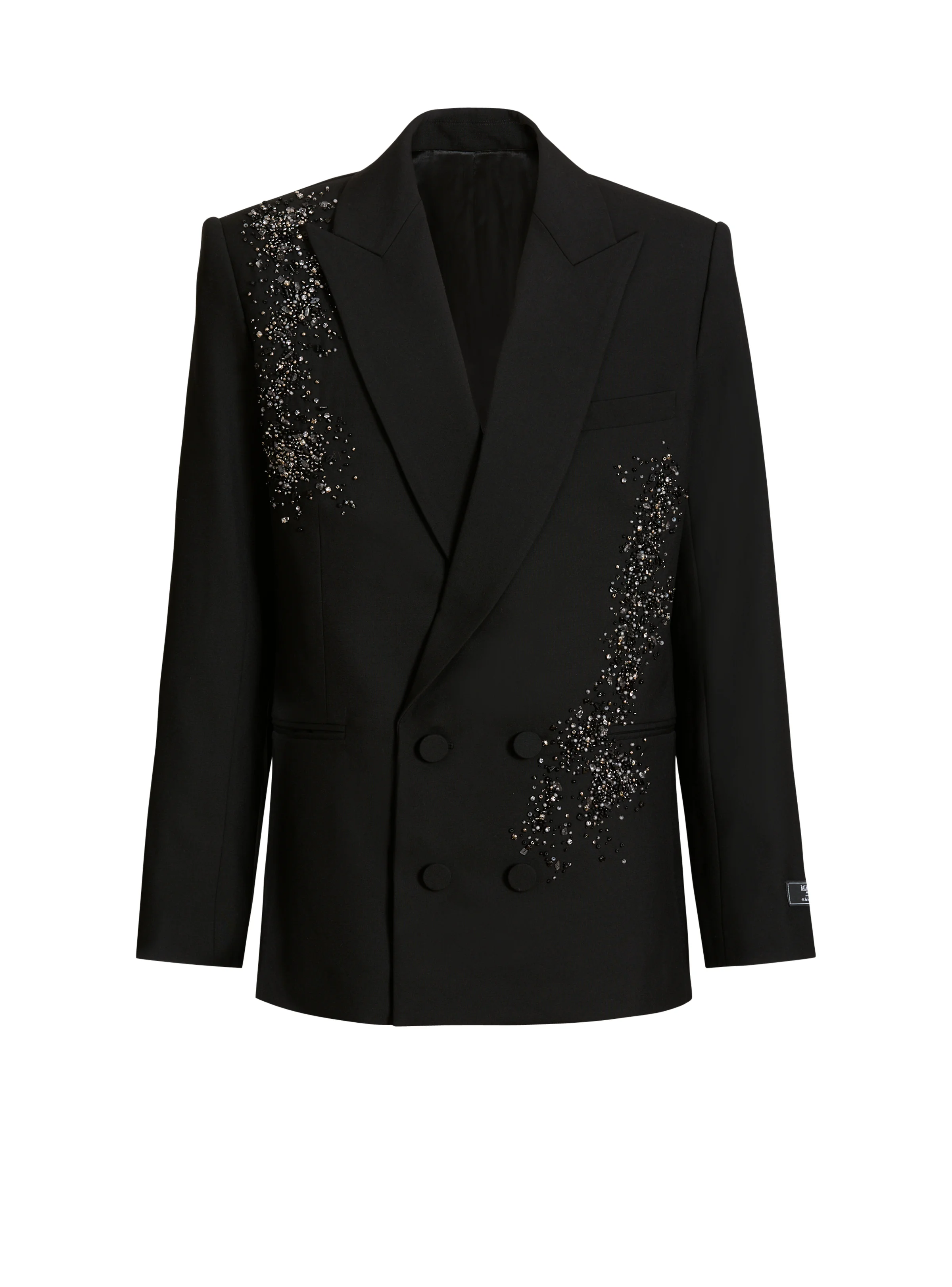 Wool blazer with Sand Effect Amethyst embroidery - Straight cut - Sand Effect Amethyst embroidery in mixed beads, sequins and crystals - Italian tailored collar - Double-breasted fastening - 4 matching covered buttons - Structured shoulders - Long sleeves - Tailored cuffs with 4 embroidered buttonholes - Balmain Paris label on the cuff - 1 breast pocket, 2 welt pockets, 2 inside pockets - Satin lining - Model measures 189cm and wears a size 48 - Main material: 100% virgin wool - Made in India - Item: GH0SI900PD43100% of the wool fibres used to make this garment are sourced from sheep farms that are certified and animal welfare-friendly