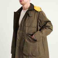 Kaptain Sunshine, the cult Japanese brand known for its elevated utilitarianism, reimagines Barbour’s iconic Bedale field coat with a contemporary twist. This oversized trench, cut from dry wax fabric, offers a crisp silhouette perfect for layering. A detachable wool hood adds seasonal versatility, while Barbour’s signature bellow pockets bring a touch of rugged charm that balances form and function with effortless style. - 100% Cotton - Detachable Hood - 2 Chest Pockets - Snap Button Closure - 2 Bellows Pockets - Drawstring Waist - Style Code: MCA1071BR53