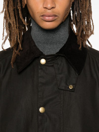 Beausby coat Highlights - Olive green - Cotton - Wax coated - Front press-stud and zip fastening - Corduroy collar - Throat latch - Long sleeves - Press-stud fastening cuffs - Two side welt pockets - Two front flap pockets - Checked lining - Internal pocket - Straight hem Imported Composition Outer: Cotton 100% Lining: Polyester 100%, Cotton 100% SIZE & FIT Model measurements Height 6 ft 2 in(1.88 m) Bust/Chest 35.43 in(90 cm) Hips 36.61 in(93 cm) Waist 27.95 in(71 cm) FittingInformation Designed to be unstructured, offering a loose fit throughout Made from a midweight non-stretch fabric Washing instructions Do Not Wash/Do Not Dry Clean