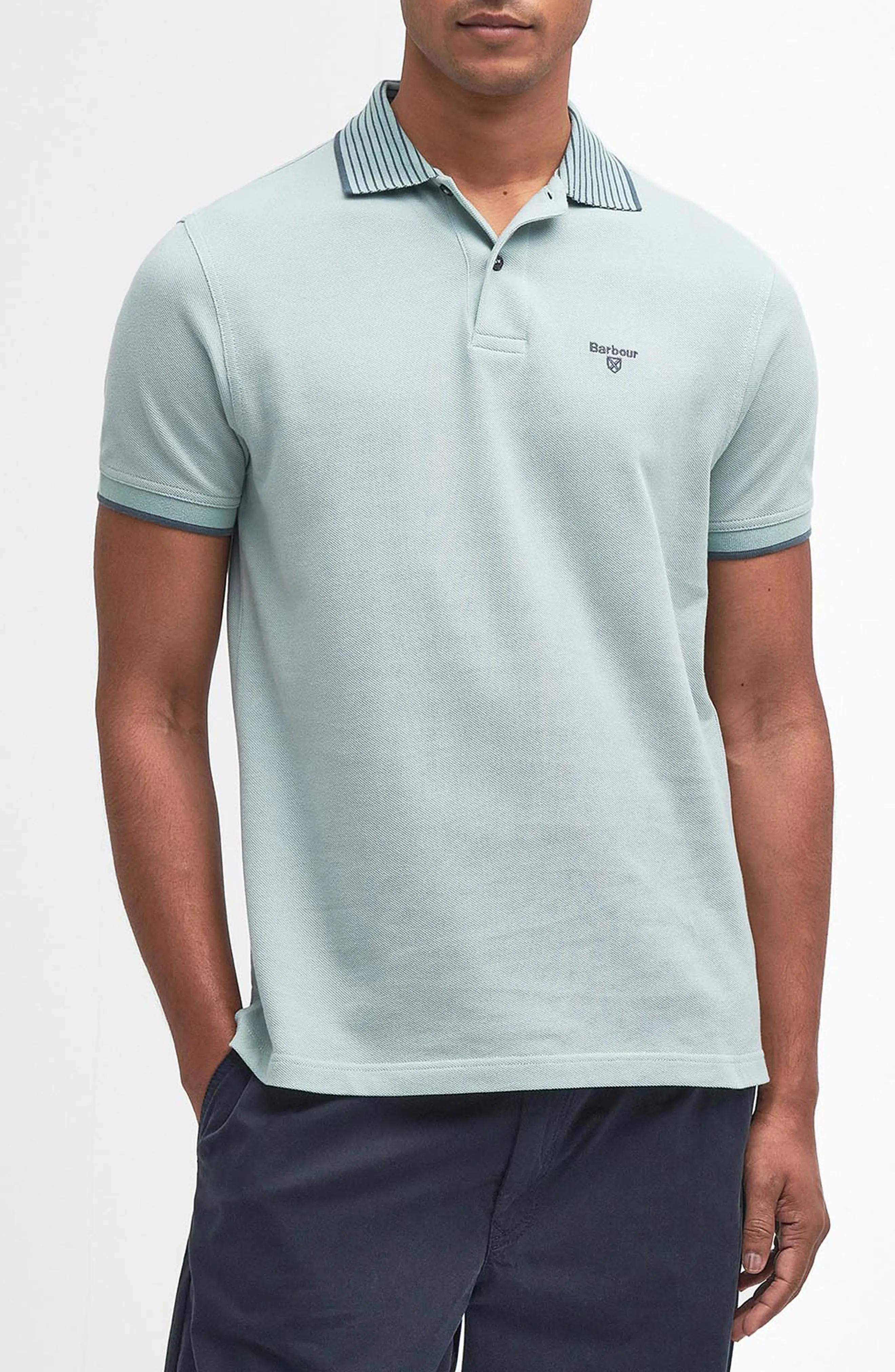 Fine stripes on the collar and contrast tipping on the cuffs add sporty touches to this classic polo cut for cool, breathable comfort from soft cotton piqué. Button half placket Spread collar Short sleeves 100% cotton Machine wash, dry flat Made in Portugal