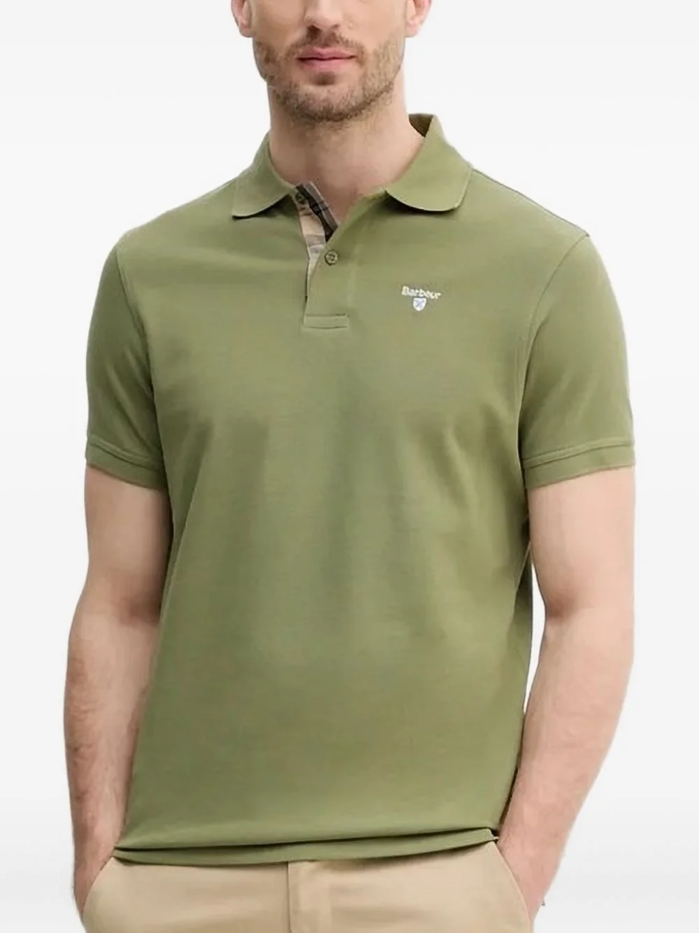 embroidered-logo polo shirt Highlights - Olive green - Short sleeves - Two button placket - Embroidered logo - Contrast check collar Imported Composition Cotton 100% Washing instructions Read Manufacturer Guidelines