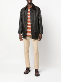 long-sleeve wax-coated jacket military green cotton wax coated corduroy collar front press-stud fastening long sleeves two front pouch pockets straight hem Made in United Kingdom Composition Cotton 100% Lining: Cotton 100% SIZE & FIT Model measurements Height 6 ft 2 in(1.87 m) Bust/Chest 35.03 in(89 cm) Hips 39.37 in(100 cm) Waist 29.13 in(74 cm) FittingInformation This piece fits true to size. We recommend you get your regular size Cut for a loose fit Made with a mid-weight non-stretch fabric Washing instructions Dry Clean Only