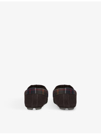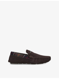 PRODUCT DETAILS - Barbour suede slippers - 100% suede - Slips on - Moccasin-style, brand metal badge at outer, tartan check panels, faux-shearling lined, tread sole - Specialist leather clean - Upper: 100% suede; contrast 100% fabric - Lining: Faux-shearling - Sole: 100% rubber Ref: R04400711