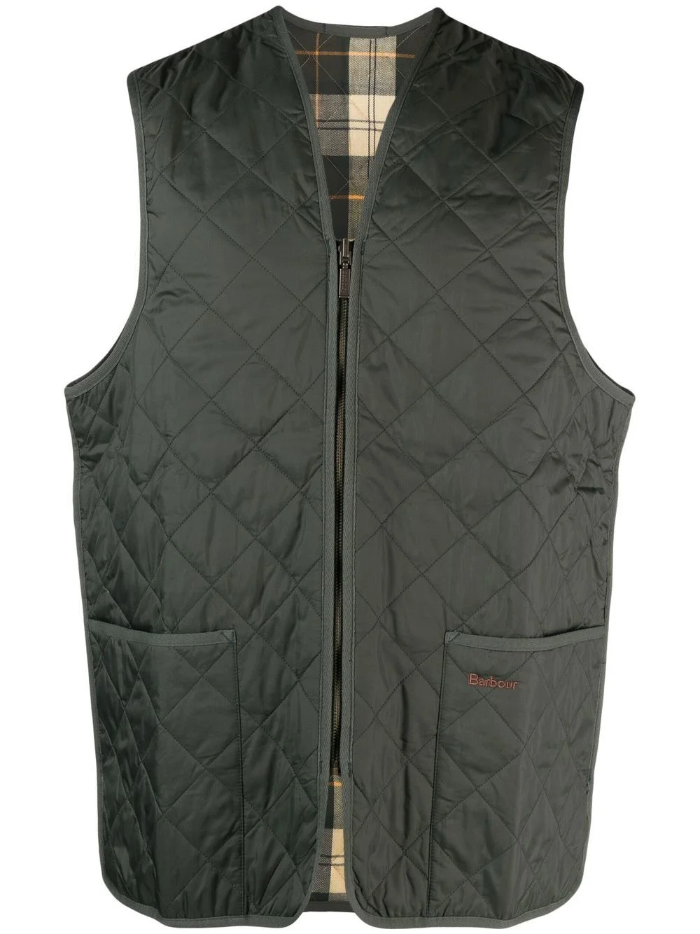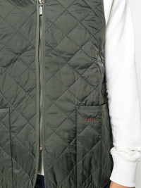 zip-up quilted gilet olive green cotton diamond quilting embroidered logo to the front cotton lining sleeveless V-neck front zip fastening two front patch pockets Made in United Kingdom Composition Lining: Cotton 100%, Polyester 100% Outer: Polyamide 100% SIZE & FIT Model measurements Height 6 ft 2 in(1.89 m) Bust/Chest 37.79 in(96 cm) Hips 37 in(94 cm) Waist 29.92 in(76 cm) Washing instructions Machine Wash