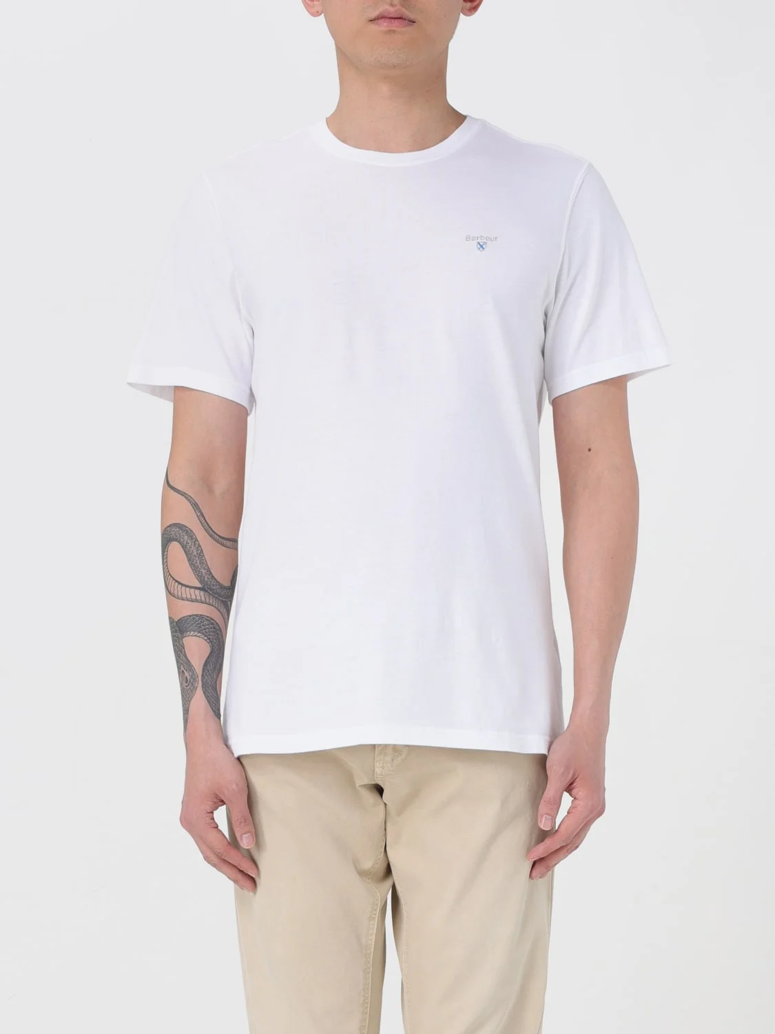 DESCRIPTION - Style: Casual - Logo: Contrasting - Model: Crewneck - Neckline: Crewneck - Shoulders: Regular - Sleeves: Short - Bottom: With straight hemline - Materials: Cotton - Pattern: Logo DETAILS AND CARE Composition not available SIZE AND FIT Sizes not available Size and fit Regular fit Designer code: MTS0670 WH11 Giglio Code: G74248 Designer: Barbour Collection: Barbour Men Category: Clothing Barbour