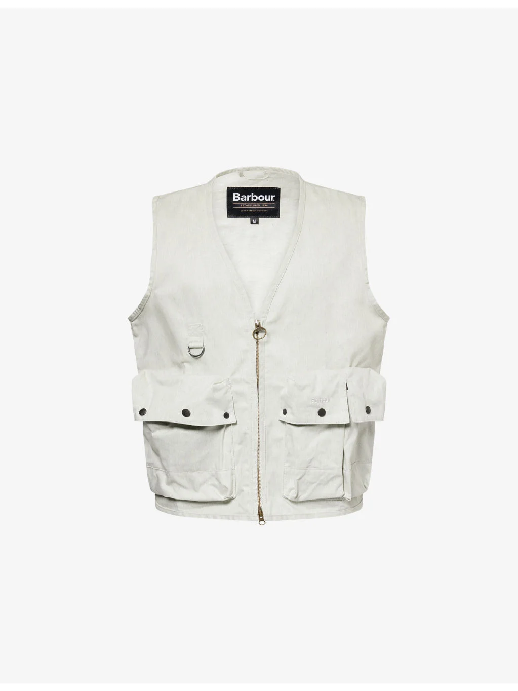 PRODUCT DETAILS - Barbour cotton vest - 100% cotton - Exposed zip fastening at front - V-neck, sleeveless, two patch pockets at front with popper closure, embroidered logo at pocket, binding at trims, straight hem - Hand wash - Size medium: length 25.5in / 65cm, chest 47.2in / 120cm - Model is 6ft 2in/1.88m and wears a size medium - Midweight, non-stretch Ref: R04464023