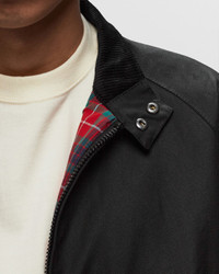Barbour x Baracuta brings together two very British brands in a celebration of iconic style. With clean lines and silhouettes, wax and casual jackets re-imagine the best of both brands' heritage alongside knitwear and shirts with signature tartan detailing and a choice of heritage t-shirts. A contemporary interpretation of much loved classics, this is a collection for today, steeped in the history of the past. - Barbour x Baracuta Porton Wax Jacket - Casual jacket with elasticated hem and cuffs - Two stud fasten pockets - Tartan lining - Floating yoke Article Number: MWX2237BK11 Gender: Men Color: LACK Material: 100% Cotton