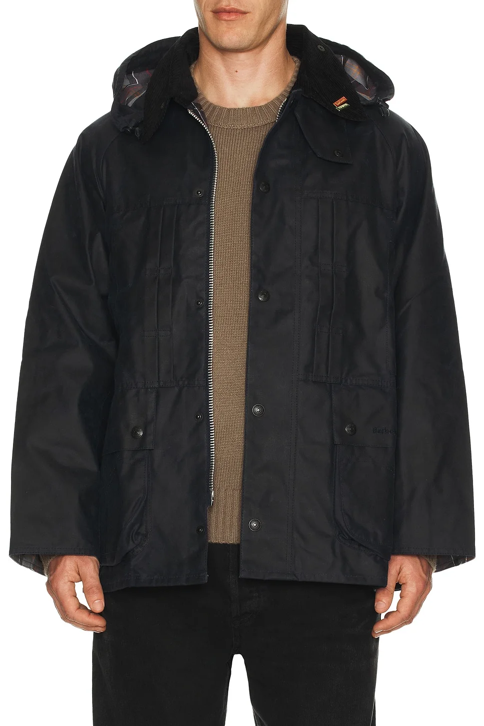 Details - Barbour x Levi's - 100% cotton - Spot clean only - Two-way front zip closure - 4-pocket styling - Detachable brand pins - Detachable drawcord hoodie - Midweight coated twill fabric - Made in Bulgaria - Our Style No. BBOU-MO34 - Manufacturer Style No. MWX2510