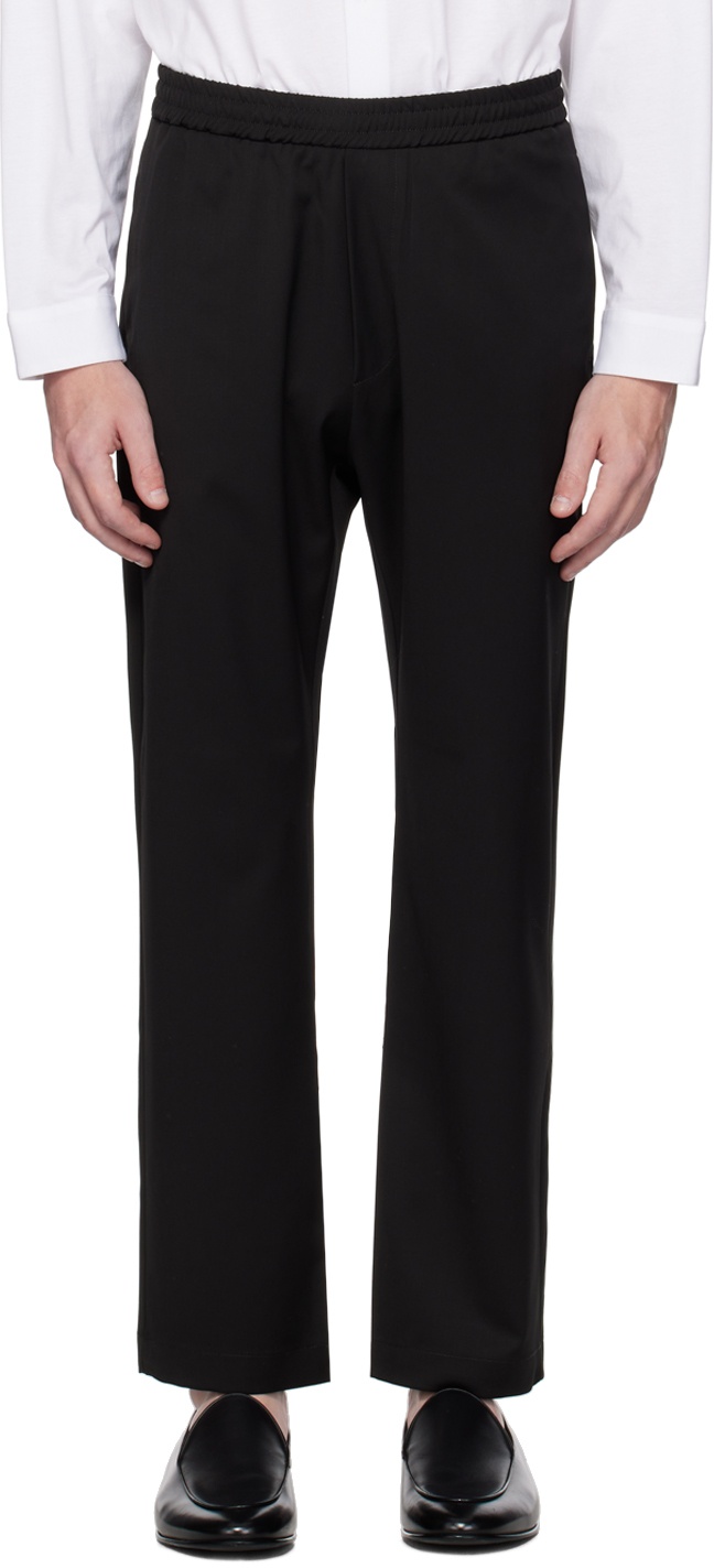 Handcrafted stretch virgin wool twill trousers. · Concealed drawstring at elasticized waistband · Four-pocket styling · Mock-fly Supplier color: Nero