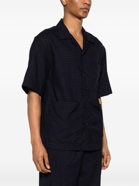 checked camp-collar shirt Highlights - Navy blue - Virgin wool blend - Interlock twill weave - Check pattern - Camp collar - Front button fastening - Short sleeves - Chest patch pocket - Two front patch pockets - Straight hem Made in Italy Composition Virgin Wool 98%, Elastane 2% SIZE & FIT Model measurements Height 6 ft 2 in(1.87 m) Bust/Chest 36.22 in(92 cm) Hips 37 in(94 cm) Waist 27.95 in(71 cm) FittingInformation Designed to be unstructured, offering a loose fit throughout Made from a lightweight stretch fabric, this piece offers elasticity and flexibility when worn This piece fits true to size – take your usual size