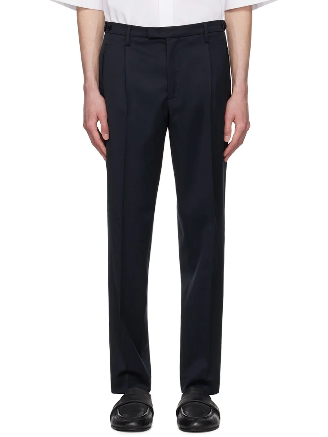 Slim-fit stretch plain-woven virgin wool trousers. · Mid-rise · Belt loops · Four-pocket styling · Zip-fly · Pleats at front · Creased legs · Button tabs at back waistband Supplier color: Navy Body: 99% virgin wool, 1% elastane. Trim: 70% cotton, 30% polyester. Lining: 100% cotton. Made in Italy 242313M191008
