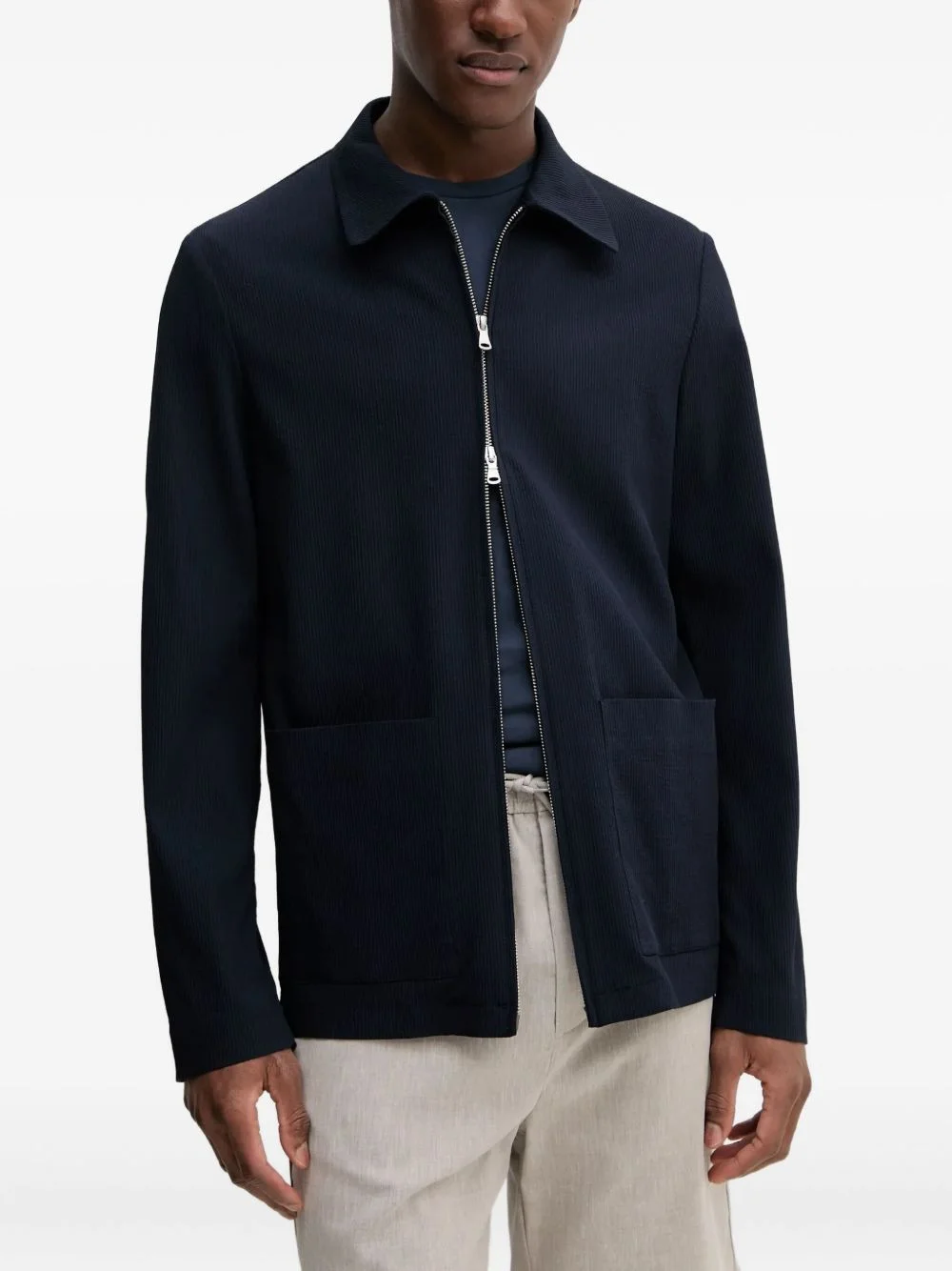 ribbed long-sleeved jacket Highlights - Navy blue - Ribbed texture - Two-way zip fastening - Patch pockets - Collared neckline - Long sleeves Imported Composition Wool 100% Washing instructions Read Manufacturer Guidelines