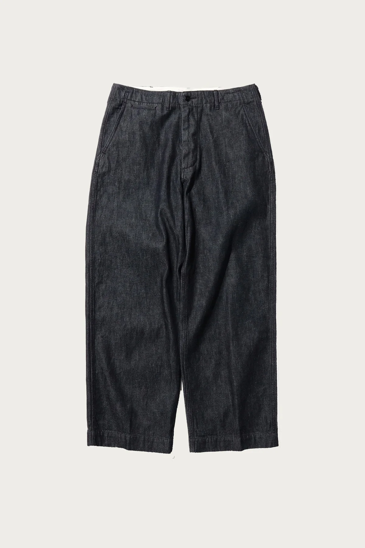 Standard military denim chino pant with a style that never seems to fade. The herringbone, folded cuff, slash pockets, and coin pocket all speak to the lack of corners cut. Fits True To Size. - Denim - Zip Closure - Mid-Rise - Back Welt Pockets - Made In Japan - One Wash