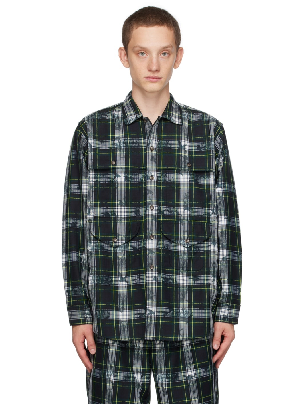 Polyester- and rayon-blend twill shirt. Check pattern throughout. · Spread collar · Button closure · Flap pockets · Shirttail hem · Adjustable single-button barrel cuffs Supplier color: Navy/Gordon dress