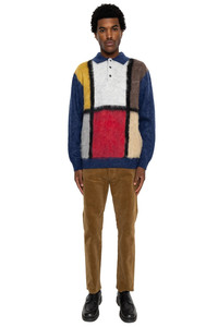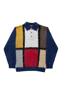 - Designed based on vintage knitwear from the 1960s - A material knitted with 9 gauge double jacquard using extremely rare kid mohair blend yarn 1/13. - Brushed for a soft finish - Color: Blue - 42% nylon, 35% wool, 23% mohair - Model is 6'2 wearing a size L