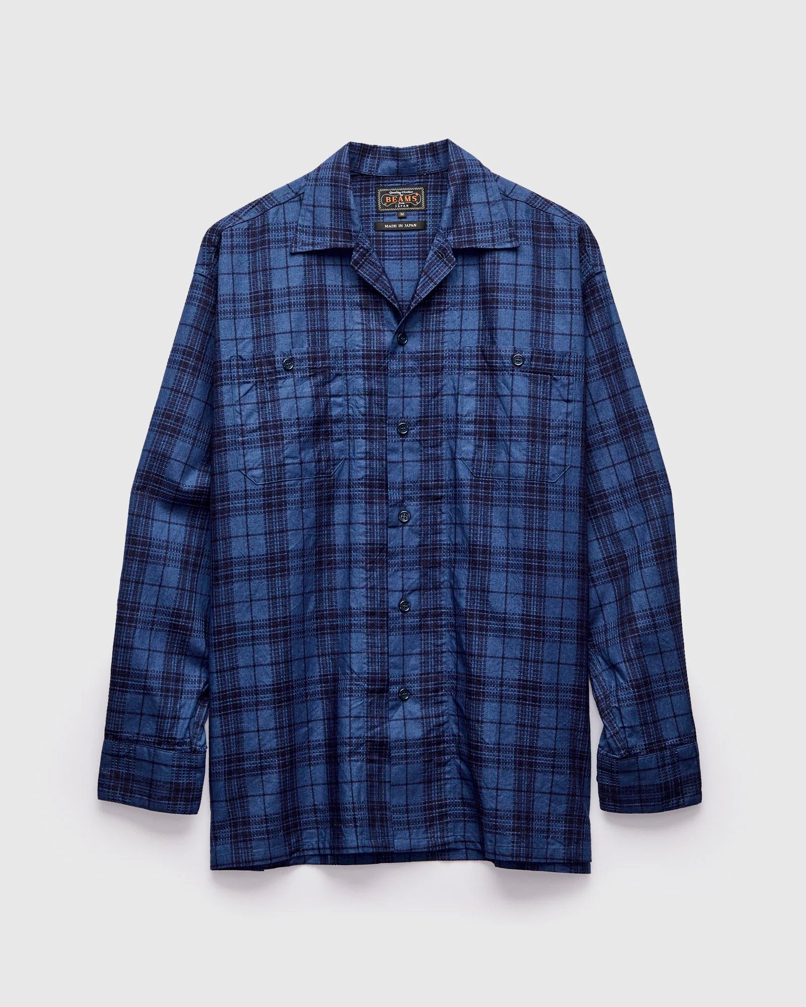 MIL Dobby Plaid Open Collar Shirt in Indigo
