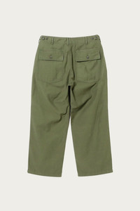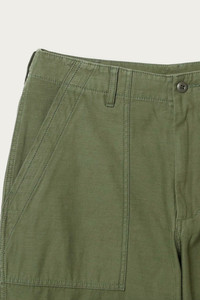 An essential fatigue silhouette done right. The reversed sateen fabric delivers structure and comfort, with a soft interior and durable outer face that will break in over time. The olive green tone stays true to its military roots while remaining endlessly wearable. The straight, easy leg gives the trousers presence without feeling oversized. Large patch pockets and button details reinforce the heritage inspiration. Pair them with a chambray shirt and canvas sneakers for a classic approach, or offset the utilitarian feel with a tailored jacket and simple leather shoes.