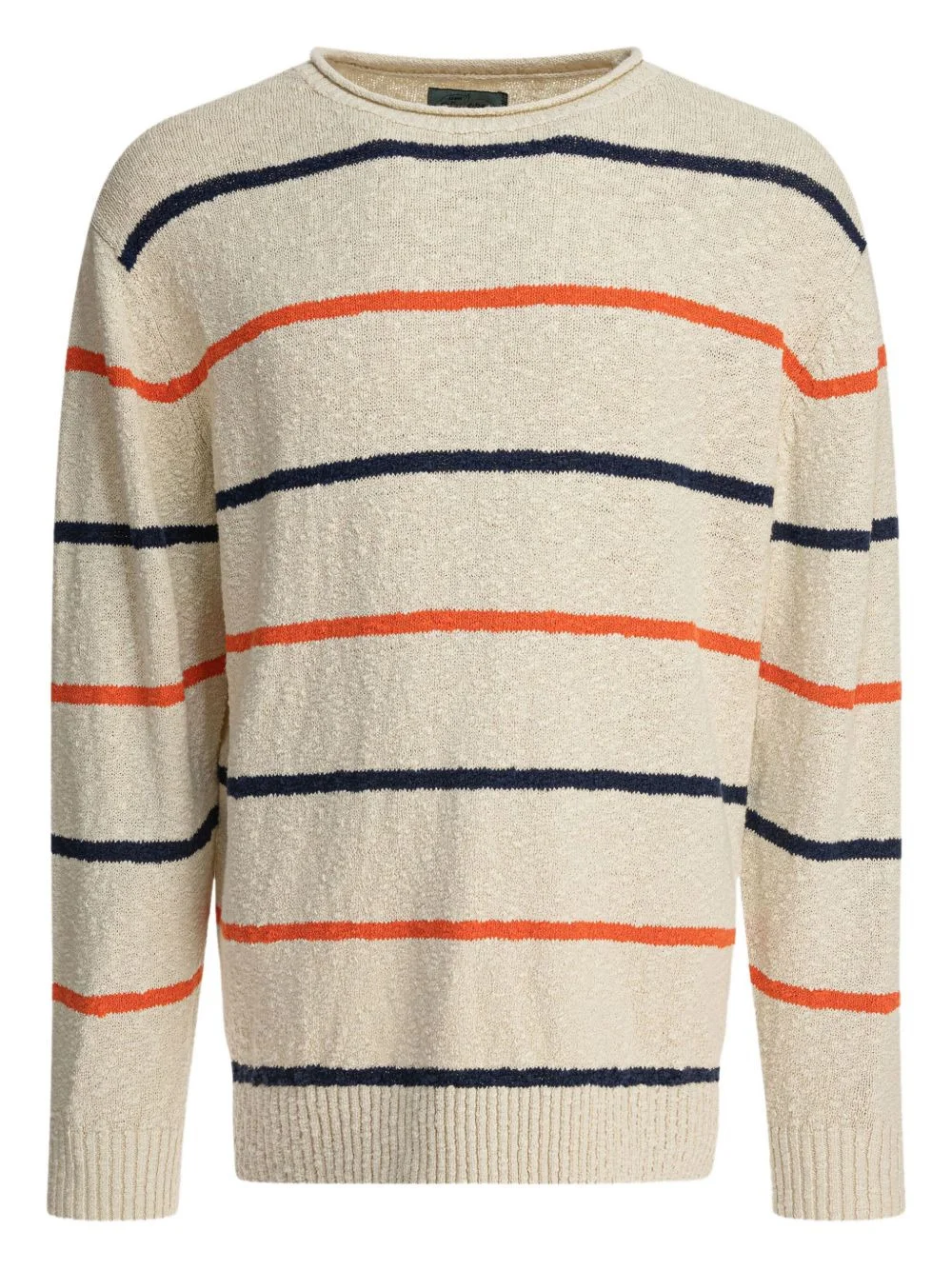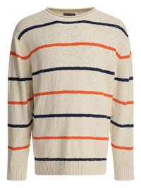 striped cotton-blend sweater Highlights - Off-white - Horizontal stripes - Navy stripes - Orange stripes - Textured knit - Crew neck Imported Composition Cotton 87%, Linen/Flax 8%, Nylon 4%, Polyurethane 1% Washing instructions Read Manufacturer Guidelines