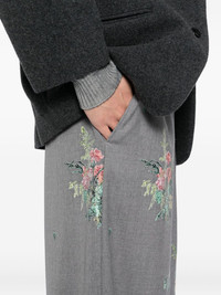 floral embroidered trousers Highlights - Steel grey - Concealed front button fastening - Two side slash pockets - Two rear flap pockets Imported Composition Wool 100% SIZE & FIT Model measurements Height 6 ft 2 in(1.87 m) Bust/Chest 33.07 in(84 cm) Hips 35.43 in(90 cm) Waist 26.77 in(68 cm) FittingInformation Designed with a wide leg, offering a loose and roomy fit The elasticated waist allows for a comfortable fit Made from a lightweight non-stretch fabric Washing instructions Dry Clean Only
