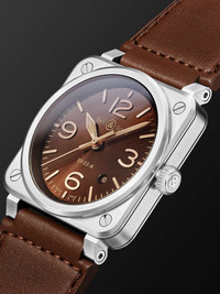 Modelled on Air Force cockpit instruments, Bell & Ross' 'BR 03' watch has been crafted by hand in La-Chaux-de-Fonds, Switzerland to ensure faultless performance and quality. It's powered by an automatic movement and has gold-tone, luminescent hands and a lustrous brown dial. The sleek square case, made from satin-polished steel, has made the 'BR 03' one of the most recognisable designs in watchmaking. For warranty information, please refer to details & care Details & Care Movement - Swiss-made calibre BR-CAL.302 automatic movement with 54-hour power reserve - 25 jewels, 28,800 Vph Functions - Hour, minute and second hands - Date window Dial - Brown dial - Gold-tone Super-LumiNova® hands, Arabic numerals and indices - Case - Satin-finished stainless steel case - Crown for time adjustments and manual winding - Sapphire glass crystal - Engraved case back - Pin buckle-fastening brown leather (Calf) strap Specifications - Case diameter: 41mm; case thickness: 9.65mm - Water resistance: 10 bar - Comes in a presentation box - Reference number: BR03A-GH-ST/SCA We offer a two-year warranty for all working parts and manufacturing faults for luxury watches. For more information, contact one of our experts by emailing watches@mrporter.com