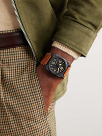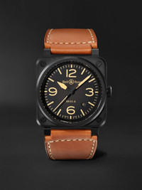 Designed for pilots, astronauts and other aeronautical professionals, Bell & Ross' 'BR 03 Heritage' is powered by the brand's latest calibre BR-CAL.302 automatic movement. Made from micro-blasted ceramic that's durable, lightweight and scratchproof, it features the circle-in-a-square build and four screws, which has become the signature design of the house. The black dial is punctuated by bold, photoluminescent numerals for clear readability and also has a date window at the 4:30 mark, while the robust leather strap means it's suitable for a range of occasions. For warranty information, please refer to details & care Details & Care Movement - Swiss-made calibre BR-CAL.302 automatic movement with 54-hour power reserve - 25 jewels, 28,800 Vph Functions - Hour, minute and second hands - Date window Dial - Black dial - Beige Super-LumiNova® hands, Arabic numerals and indices Case - Black cermaic case - Crown for date and time adjustments and manual winding - Sapphire glass crystal - Engraved case back - Ardillon buckle-fastening brown leather (Calf) strap Specifications - Case diameter: 41mm; case thickness: 9.65mm - Water resistance: 10 bar - Comes in a presentation box - Reference number: BR03A-HER-CE/SCA We offer a two-year warranty for all working parts and manufacturing faults for luxury watches. For more information, contact one of our experts by emailing watches@mrporter.com