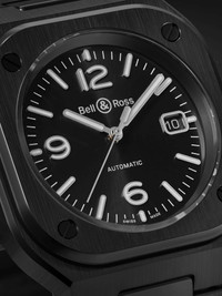 Bell & Ross' watch is a blacked-out version of its signature 'BR 05' reference, which was initially developed for pilots, astronauts and deep-sea divers. Set on a PVD strap, it's made from sleek black ceramic – a material prized for its robustness – and is the first of its kind to feature a 41mm case. Beneath the sunray dial lies a Swiss-made calibre BR-CAL.322 automatic movement, which offers 54 hours' power reserve. For warranty information, please refer to details & care Details & Care Movement - Swiss-made calibre BR-CAL.322 automatic movement with 54-hour power reserve - 25 jewels, 28,800 Vph Functions - Hour, minute and second hands - Date window Dial - Black dial - Super-LumiNova® hands, Arabic numerals and indices - Case - Satin-finished black ceramic case - Crown for date and time adjustments and manual winding - Sapphire glass crystal - Exhibition case back - Folding clasp-fastening black PVD bracelet Specifications - Case diameter: 41mm; case thickness: 11.2mm - Water resistance: 10 bar - Comes in a presentation box - Reference number: BR05A-BL-CE/SCE We offer a two-year warranty for all working parts and manufacturing faults for luxury watches. For more information, contact one of our experts by emailing watches@mrporter.com