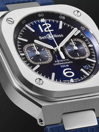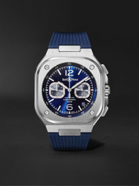 Bell & Ross' 'BR 05' watch is crafted to feel modern and sporty, while staying true to the house's geometric design codes. The satin-polished stainless steel case and bezel are neatly squared and anchored by four signature screws. It's set with a recessed round dial and has Super-LumiNova®-filled hands, numerals and indices to ensure maximum legibility at all times. The flexible rubber strap sits comfortably flush with the lugs and is durable enough to stand up to daily wear. We offer a two-year warranty for all working parts and manufacturing faults for luxury watches. For more information, contact one of our experts by emailing watches@mrporter.com Details & Care Movement - Swiss-made calibre BR-CAL.321. automatic movement with 42-hour power reserve - 25 jewels, 28,800 Vph Functions - Hour, minute and second hands - Date window - Chronograph: 30-minute counter at 9 o'clock, central chronograph seconds Dial - Blue sunray-brushed dial - Super-LumiNova®-filled numerals and indices. Metal skeletonised Super-LumiNova®-filled hour and minute hands - Case - Satin-finished and polished stainless steel case - Crown for time adjustments and manual winding - Sapphire glass crystal - Exhibition case back - Buckle-fastening blue rubber strap Specifications - Case diameter: 42mm - Water resistance: 10 bar - Comes in a presentation box - Reference number: BR05C-BUBU-ST/SRB - This item has been imported