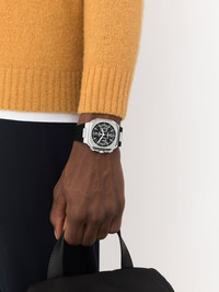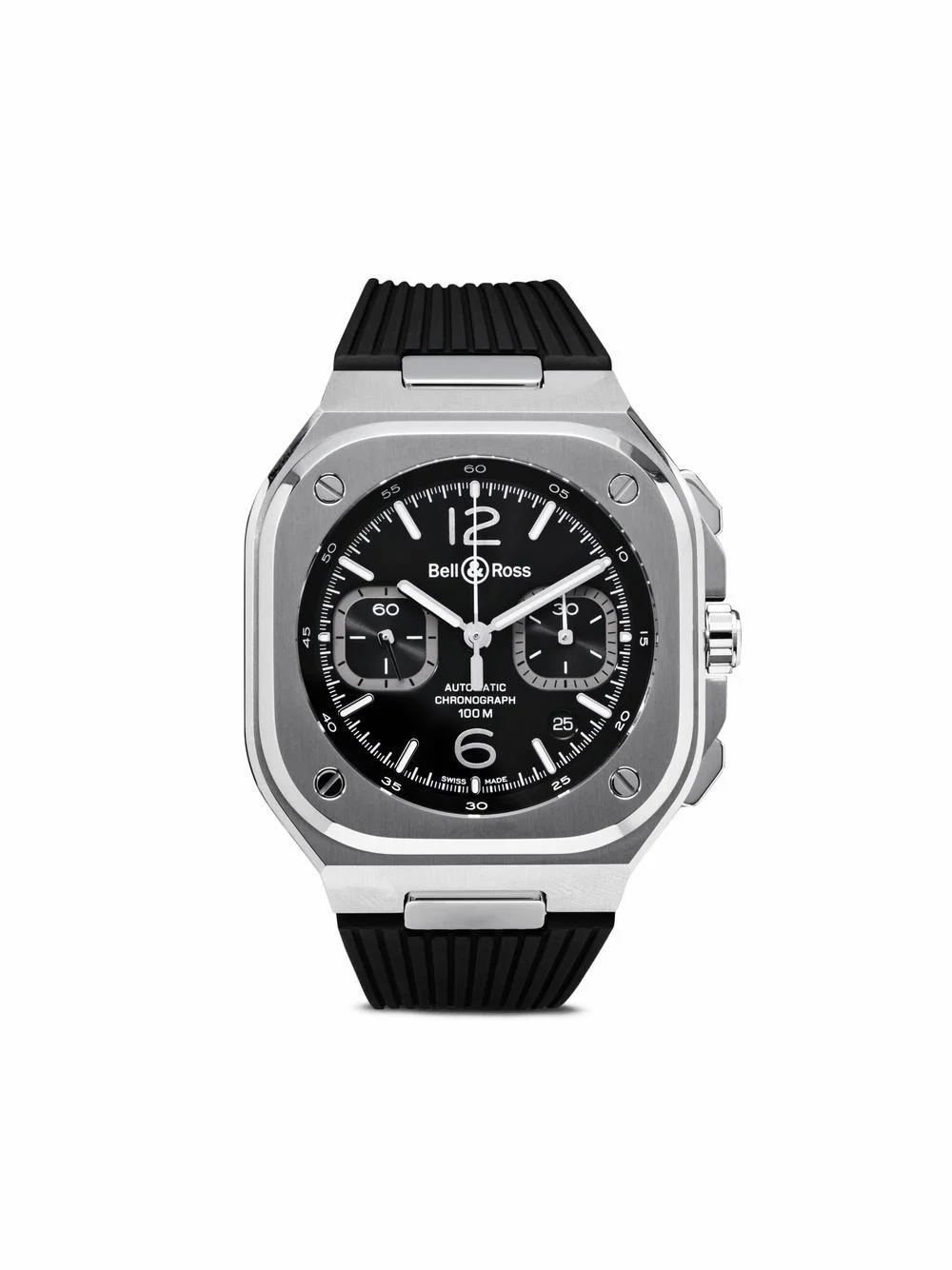 BR-05 Chrono 42mm Known for their aviation-influenced aesthetic and streamlined designs, Bell & Ross handcraft immaculate timepieces in Switzerland that ensure faultless quality. Designed for professionals in extreme environments, the BR 05 series offers a new and urban finish to the classic collections, like this BR-05 Chrono 42mm. Highlights - 42mm - Black - Stainless steel - Cushion face - Baton dial - Baton hands - Date indication - Chronograph counters - Screw-down crown - Rubber strap - Buckle fastening - Automatic movement - Water resistance up to 100m/10 atm - This item comes with a standard two-year warranty from the brand. Imported Composition Sapphire 100%, stainless steel 100%, Rubber 100% SIZE & FIT Model measurements Height 6 ft 0 in(1.84 m) Bust/Chest 36.22 in(92 cm) Hips 35.43 in(90 cm) Waist 26.77 in(68 cm) Measurement Case size 1.77 in(45 mm) Case thickness 0.51 in(13 mm) Maximum strap length 9.44 in(24 cm) Minimum strap length 7.28 in(18.5 cm) Strap width 0.94 in(24 mm)
