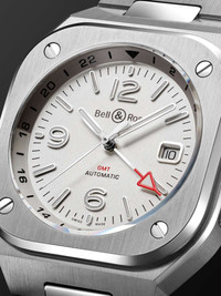 Bell & Ross' 'BR 05 GMT' has a classic sports watch feel, with a round dial inside a substantial square case. A great choice for frequent flyers, it features a GMT complication, which presents dual time zones alongside a date window at 3 o'clock. The dial is opaline white, the colour of which was tried and tested to reach the perfect shade. Note how the satin-finished stainless steel case is integrated into the bracelet, creating a seamless, unified piece. For warranty information, please refer to details & care Details & Care Movement - Swiss-made calibre BR-CAL.325 automatic movement with 40-hour power reserve 25 jewels, 28,800 Vph Functions - Hour, minute and second hands Date window Dial - Silver opaline dial White Super-LumiNova® numerals and indices, Super-LumiNova® hour and minute hands, GMT hand with red Super-LumiNova®-filled skeletonised triangular point Case - Satin-finished stainless steel case - Crown for date and time adjustments and manual winding - Sapphire glass crystal - Exhibition case back Folding buckle-fastening satin-finished stainless steel bracelet Specifications - Case diameter: 41mm; case thickness: 11.07mm - Water resistance: 10 bar - Comes in a presentation box - Reference number: BR05G-SI-ST/SST We offer a two-year warranty for all working parts and manufacturing faults for luxury watches. For more information, contact one of our experts by emailing watches@mrporter.com