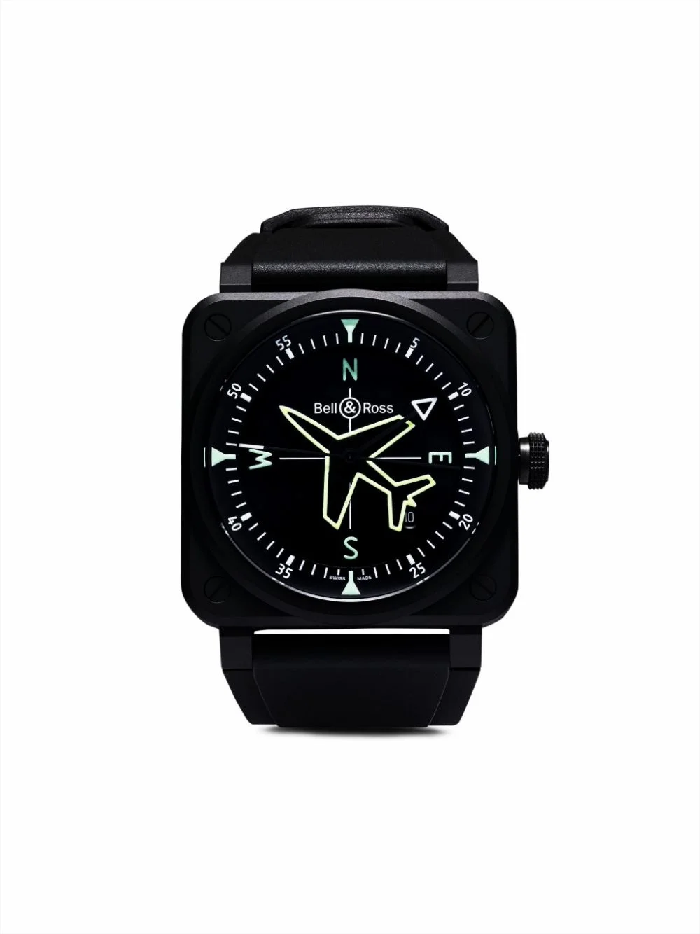BR 03 Gyrocompass 41 mm Bell & Ross' BR03 model is a sleek watch distinguished by an aeroplane print on the face. The signature circular face sits within a square frame that's secured with four screws. Highlights - 41mm - Black - Sapphire - Automatic movement - Round face - Index hands - Buckle-strap fastening - Your purchase will arrive with a gift box. Imported Composition ceramic 100%, Sapphire 100%, Silicone 100% SIZE & FIT Model measurements Height 6 ft 0 in(1.84 m) Bust/Chest 36.22 in(92 cm) Hips 35.43 in(90 cm) Waist 26.77 in(68 cm) Measurement Case size 1.61 in(41 mm) Case thickness 0.43 in(11 mm) Maximum strap length 9.05 in(23 cm) Minimum strap length 7.48 in(19 cm) Strap width 1.22 in(31 mm)