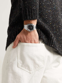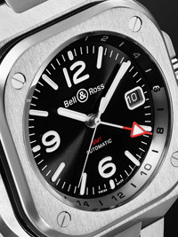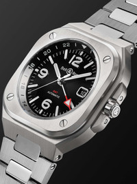 Useful for frequent travellers and those with transnational business, Bell & Ross' 'BR 05' GMT watch has an additional hand and bi-directional bezel that let you easily track multiple time zones at once. It's crafted from stainless steel in a neat, utility-driven design referencing aircraft cockpit instruments - the four-lugged squared case with rounded corners is a distinctive signature of the straight-forward model. We offer a two-year warranty for all working parts and manufacturing faults for luxury watches. For more information, contact one of our experts by emailing watches@mrporter.com Details & Care Movement - Swiss-made calibre BR-CAL.325 GMT automatic movement with 40-hour power reserve - 25 jewels, 28,800 Vph Functions - Hour, minute and second hands, second 24-hour time zone GMT hand - Date window Dial - Black sunray dial - Super-LumiNova® hands, Arabic numerals and indices - Case - Satin-finished stainless steel case - Crown for date and time adjustments and manual winding - Sapphire glass crystal - Exhibitions case back - Folding clasp-fastening stainless steel bracelet Specifications - Case diameter: 41mm - Water resistance: 10 bar - Comes in a presentation box - Reference number: BR05G-BL-ST/SST