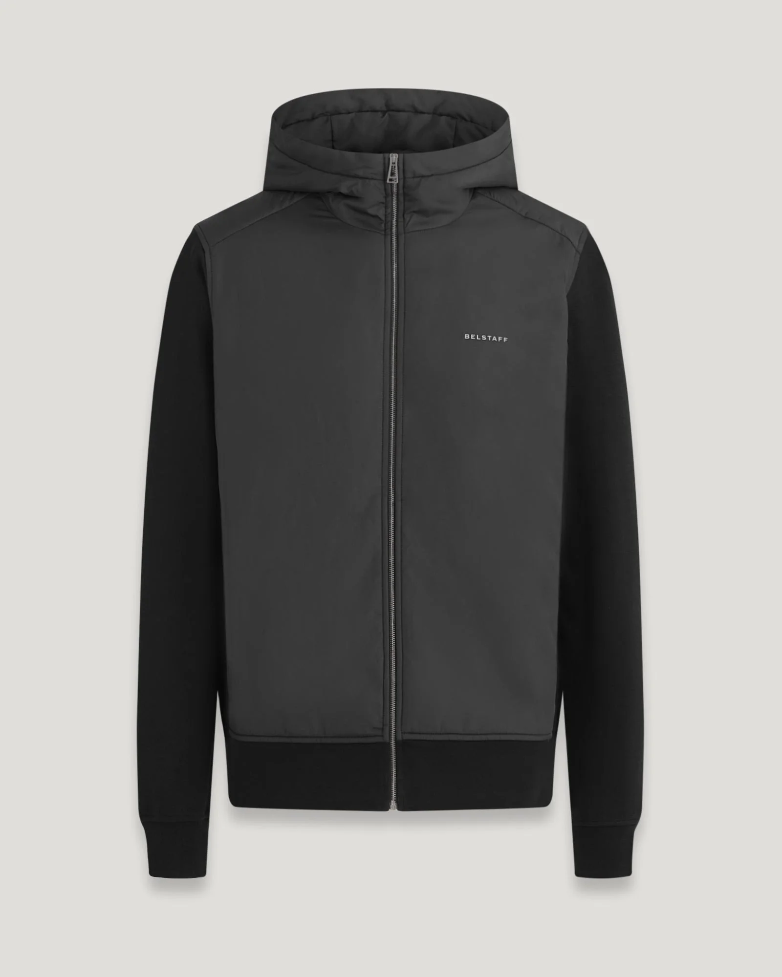 The Alloy zip through hoodie in Black is expertly crafted from compact, double-faced sweatshirt fabric with nylon panelling. It is accompanied by high thread count stretch cotton sleeves and trims and is finished with polished metal hardware. DETAILS - A compact double face knitted interlock sweatshirt fabric with technical shell nylon panelling - Lightweight insulation - Gunmetal hardware - Silicone Belstaff logo on left chest - Centre front full length zip - Waist pockets with press stud fastening - Recycled polyester - By choosing our cotton products, youare supporting Belstaff`s investment in Better Cottonas mission. This product is sourced via a system of mass balance and therefore may not contain Better Cotton. Learn more at bettercotton.org/learnmore - Body: 100% Cotton, Filling: 100% Polyester, Woven: 100% Polyester - Rib: 98% Cotton, 2% Elastane - Product ref: 105239BLACK SIZE AND FIT - Cut for a regular fit - Model wears a size L - Model measures: Height: 6'1", Chest: 39", Waist: 32a