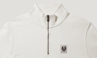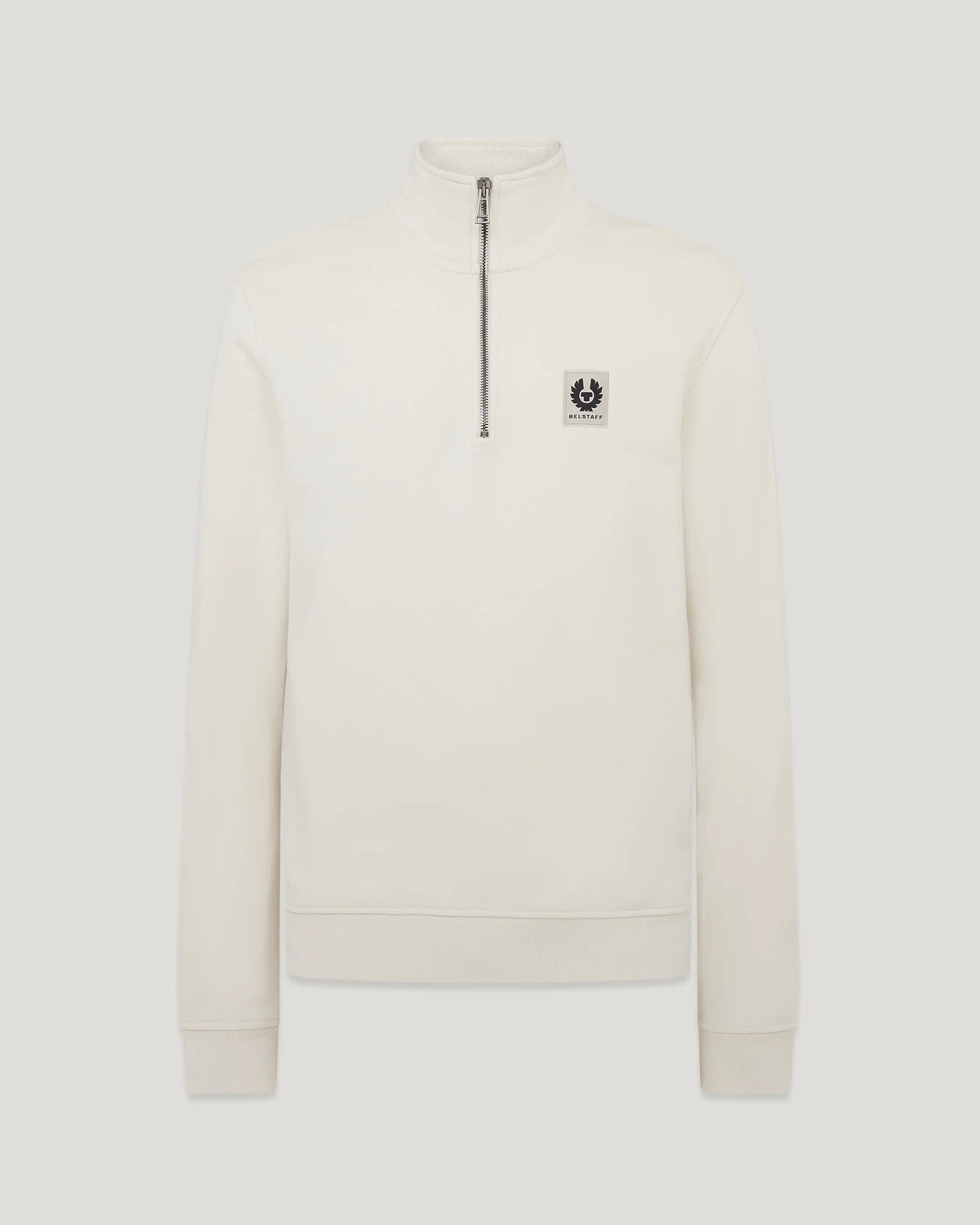 The Belstaff Quarter Zip in Silver Birch. This simple sweatshirt is crafted from Signature Belstaff fleece cotton and features a high zip collar and our badge of honour on the chest. DETAILS - Signature Belstaff fleece cotton - Long sleeves - Ribbed collar and cuff - Belstaff phoenix patch on left chest - Global Organic Textile Standard - Main material: 100% Cotton - Product ref: 103001SVRBC SIZE AND FIT - Cut for a regular fit