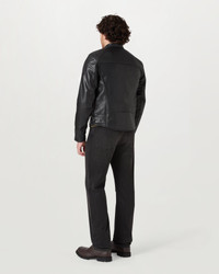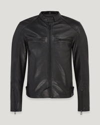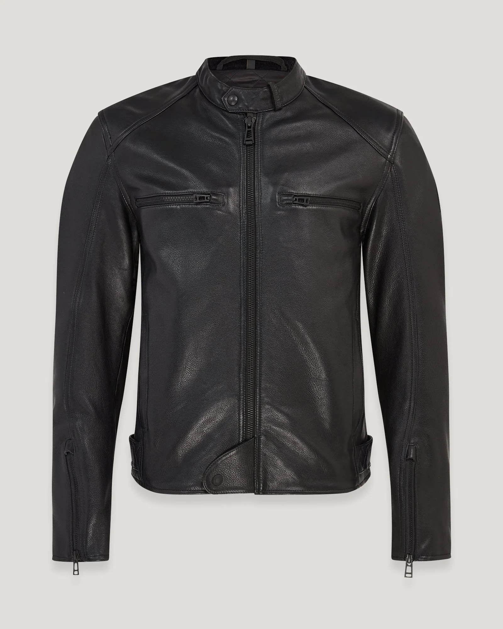 The Broughton motorcycle jacket is crafted from grain calf leather with natural wax coating, complete with D3O shoulder and elbow armour and an internal pocket for optional back protection. A kidney-shaped back panel and stud throat fastening keep out the wind with stud side-adjusters for a great fit. Oil-resistant neck and cuff facings are hard-wearing, and the rubberised stud waist closure protects paintwork. A leather embossed logo arm patch, engraved hardware and Belstaff signature stitched shoulders complete the look. DETAILS - Grain calf leather with a natural wax coating - Stylistically versatile bike-to-life cafA© racer - Leather stud closure zip guard at waist to protect tank - Kidney shaped back panel to prevent wind ingress - Leather embossed logo patch on left arm - Oil resistant corduroy neck and cuff facings - Stud throat fastening and knurled centre front zip - Stud side adjusters - Zip closure side pockets - Stealth style, engraved hardware throughout - 15cm inside zip pocket for valuables - Signature Belstaff stitched shoulder silhouette - Stud fastening internal trouser loops - Back protection pocket - Shell: 100% Cow Leather, Body and Sleeve Lining: 55% Polyester 45% Viscose, Pocket Lining: 100% Polyamide, Pocket and Collar Lining: 100% Cotton - Certification: AA - Protection: D3O Tri-ventilation level 1 (Elbow/Shoulder) - Product ref: 105536BLACK SIZE AND FIT - Cut for a regular fit - Model wears a size L - Model measures: Height: 6'1", Chest: 39", Waist: 32"
