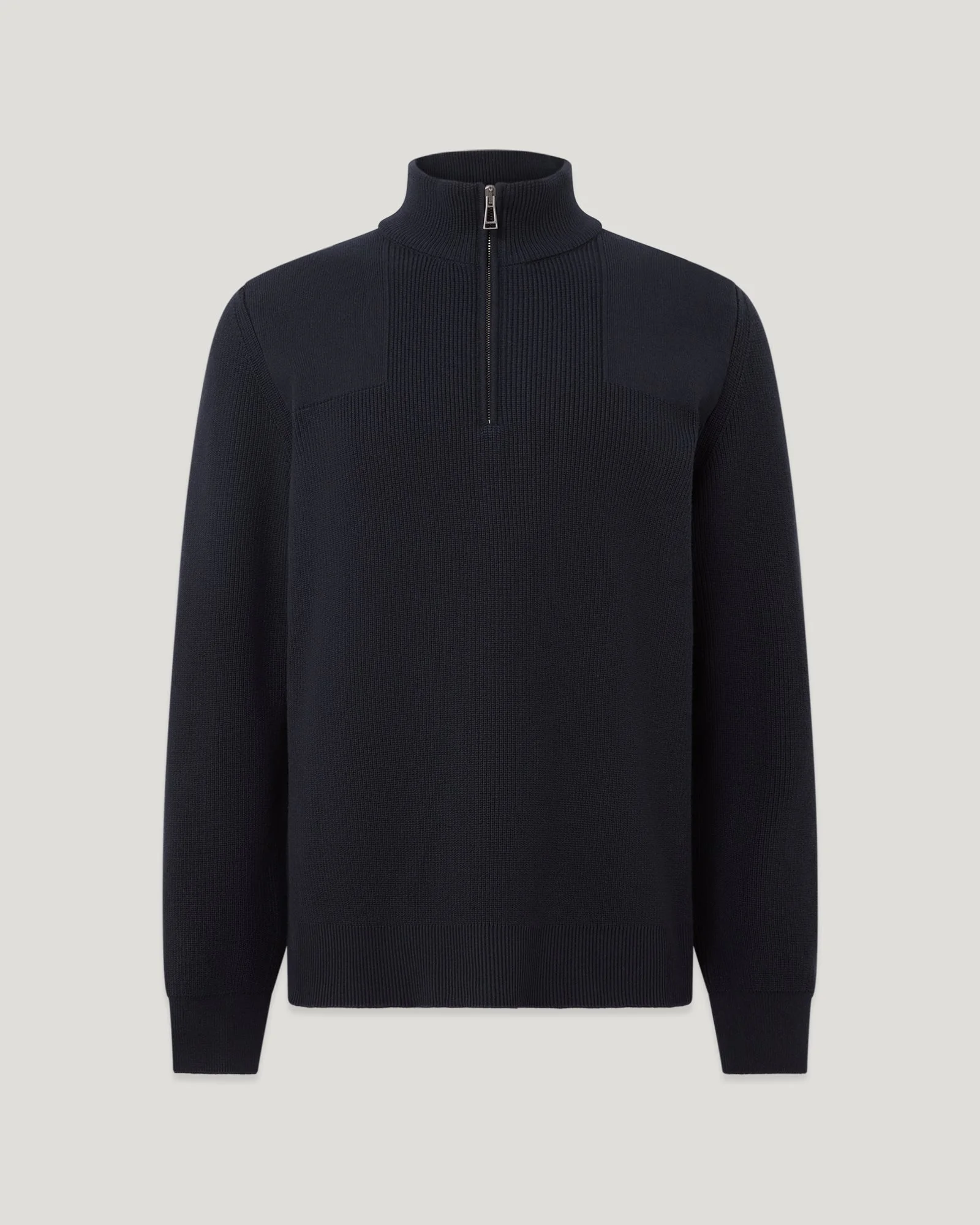 The Commander quater zip jumper in Dark Ink is an essential piece for your wardrobe. This military-inspired men’s jumper is made from 12-gauge compact organic cotton for a medium-weight finish with a good balance of warmth, breathability, and durability and is perfect for year-round layering. DETAILS - 12 gauge mercerised organic cotton - Military inspired shoulder and elbow panelling - Rib stitch - Embroidered edge tonal Belstaff phoenix patch on left sleeve - Centre front quarter zip closure - Organically grown cotton - 100% Compact organic cotton - Made in Turkey - Dyed in Italy - Product ref: 105872DKINK SIZE AND FIT - Cut for a regular fit - Model wears a size L - Model measures: Height: 6.0", Chest: 42.5", Waist: 34"