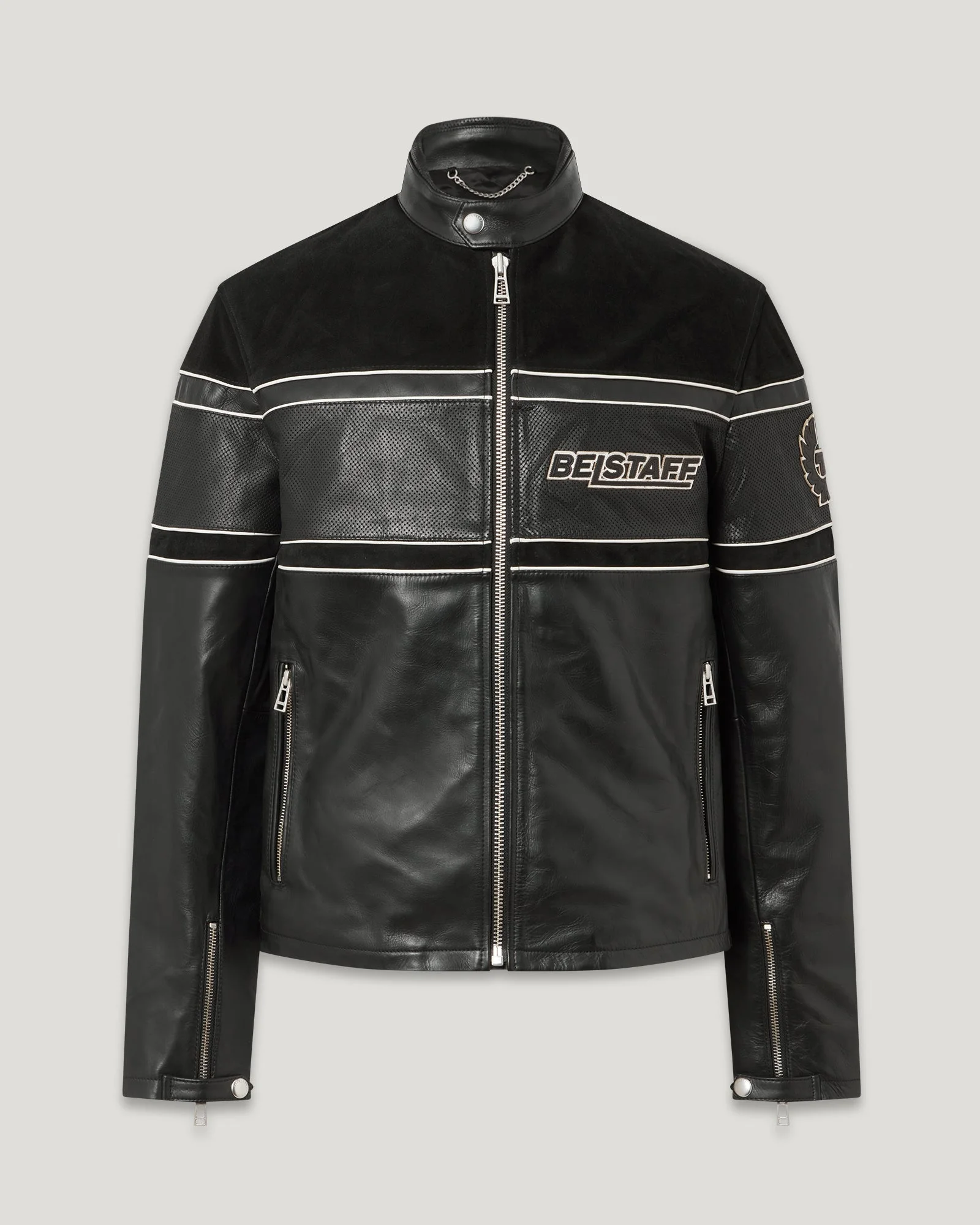 Referencing a 90s Belstaff archival motorcycle piece, our Competition Speed jacket in black is a unique outerwear style with new momentum branding. It is crafted from calf suede and cow skin – perforated and non-perforated – that is strong, durable and built to last. This must-have design will bring the energy of the ride to the everyday for years to come. DETAILS - Centre front zip closure - Cafe racer collar - Panelling with contrast and perforated sections - Two zipped hip pockets, cuff zips with snap closure - Belstaff's leather products support responsible manufacturing via the Leather Working Group - Belstaff applique at chest and back - Upper: 100% cow leather, Shell:100% cow leather, Piping: 100% sheep leather, Lining: 100% viscose - Made in India - Size M has a 63 cm back body length - Product ref: 106131BLACK SIZE AND FIT - Cut for a relaxed fit - Model wears a size L - Model measures: Height: 6.0", Chest: 40", Waist: 31"