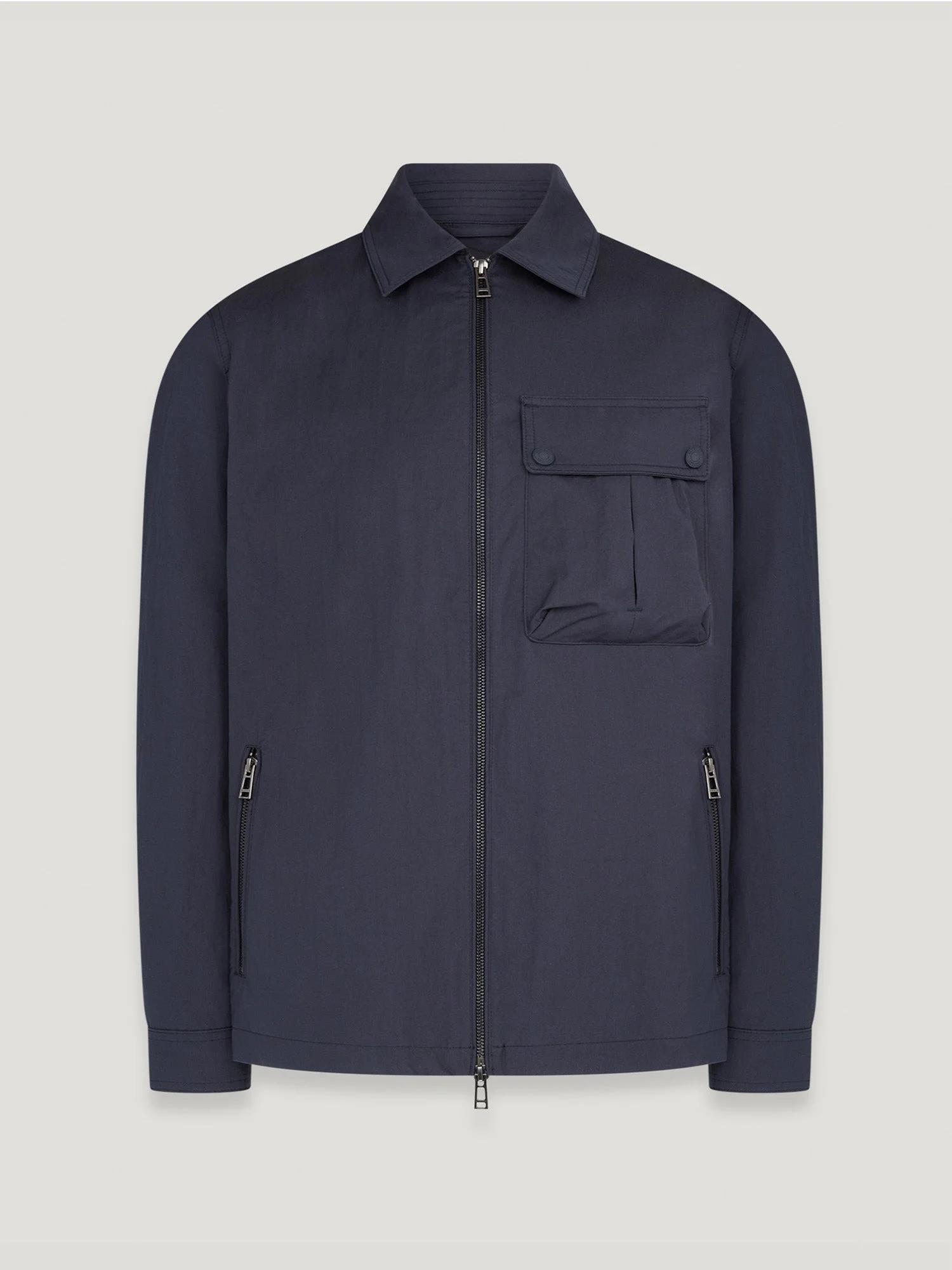The Drome overshirt in Dark Ink is a versatile piece with pleated Belstaff utility pockets. It's made from cotton nylon gabardine – combining cotton yarn with strong nylon filaments to achieve softness and smartness. The water-repellent finish is perfect for inclement weather. DETAILS - Cotton nylon gabardine with PFAS free water-repellent finish - Versatile overshirt style with utility pleated Belstaff pockets - Rubber coated tonal hardware - Tonal embroidered edge Belstaff phoenix patch on left sleeve - Centre front zip opening - Adjustable press stud cuff fastening - One bellows, pleated chest pocket, Two side entry hip pockets - Water repellent - By choosing our cotton products, youare supporting Belstaff's investment in Better Cottonas mission. This product is sourced via a system of mass balance and therefore may not contain Better Cotton. Learn more at bettercotton.org/learnmore - Shell: 60% Cotton 40% Nylon - Product ref: 105450DKINK SIZE AND FIT - Fitted across the shoulders, with an easy fit through the body - Model wears a size L - Model measures: Height: 6'3", Chest: 38", Waist: 32"