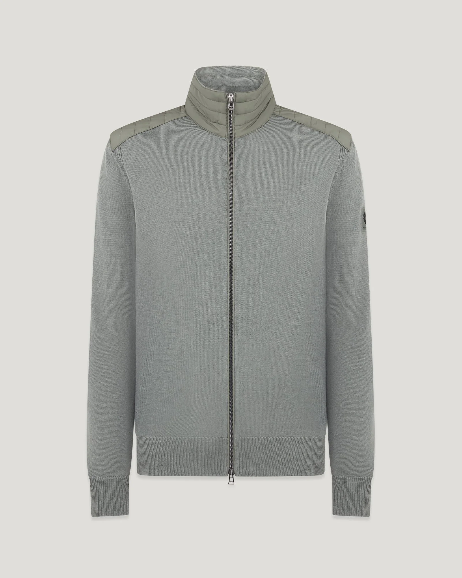Looking for a truly versatile layer? The Kelby zip cardigan in Sage Green has you covered. Wear it open as a light outer layer or zipped up through its channel-quilted stand collar. Crafted from black virgin merino wool, it’s built to see you through the seasons. DETAILS - Virgin merino wool with polyester detailing - Channel quilted shoulder reinforcement detailing - Ribbed cuffs and hem - Belstaff phoenix patch on left sleeve - Centre front full zip closure - Non-mulesed wool for animal welfare - Body: 100% Extrafine merino wool, Woven: 100% Recycled polyester, Filling: 100% Recycled polyester - Product ref: 105598SAGGR SIZE AND FIT - Cut for a slim fit - Model wears a size M - Model measures: Height: 6'1", Chest: 39”, Waist: 30"