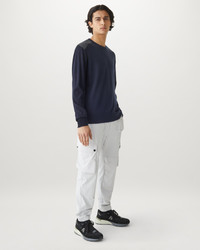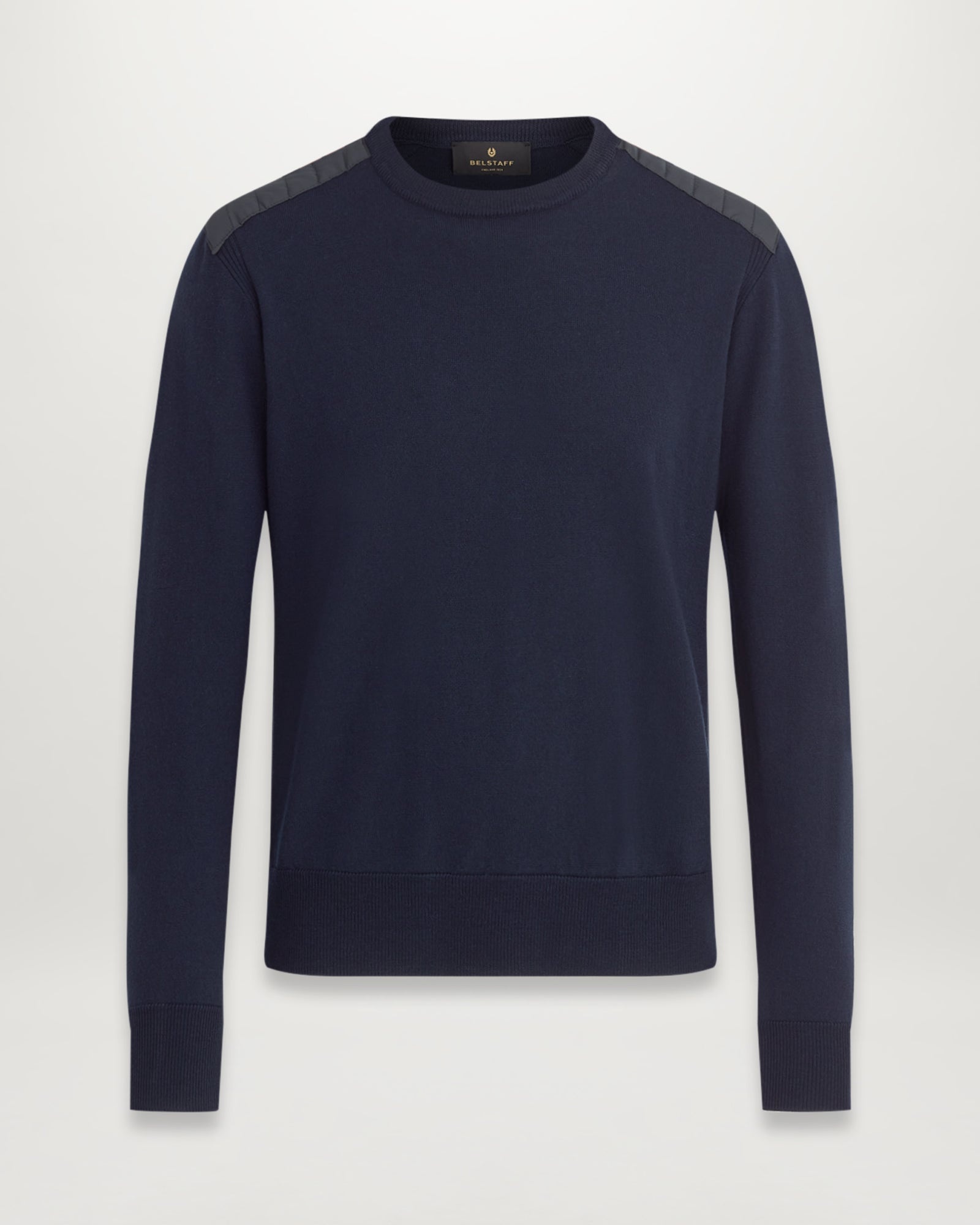 A lightweight Washed Navy jumper in extra fine merino wool. Reinforced shoulder panels give the Kerrigan Crew Neck a functional military angle. DETAILS - Extra fine merino wool, polyester patches - Knitted crewneck jumper with textured panels - Ribbed hem and cuffs - Ribbed panelling at the sides - Embroidered-edge Phoenix patch on sleeve - 100% wool with polyester panels - Product ref: 104409WSNVY SIZE AND FIT - Cut for a slim fit - Model wears a size L - Model measures: Height: 6'0", Chest: 37", Waist: 30"