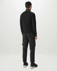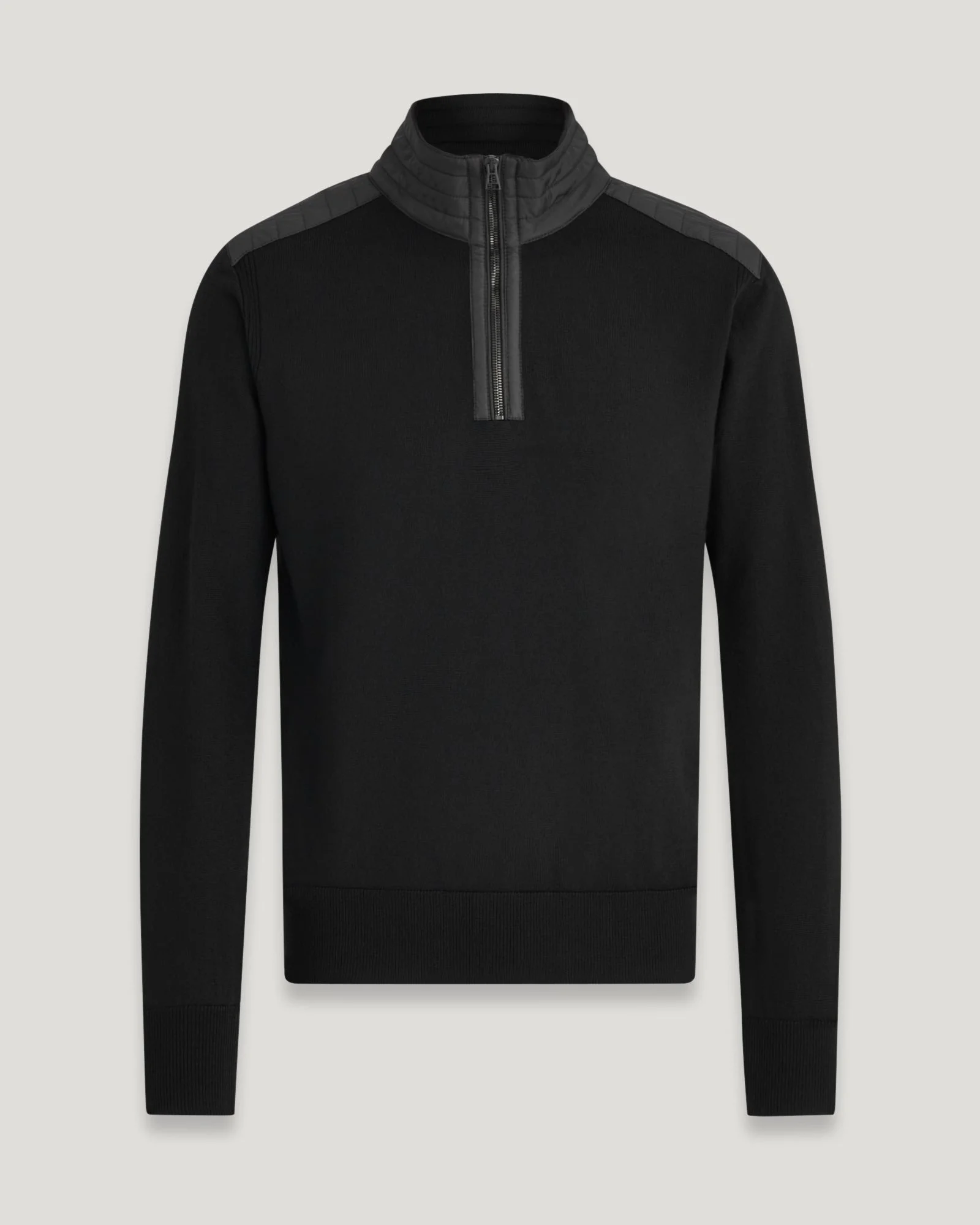 Our take on a handy quarter-zip jumper in Washed Black is a mixed-media fabrication in soft extra-fine black merino wool with textural nylon quilting. The contrast shoulder panels provide a structural element and military feel to the Kilmington, keeping you warm while commanding attention. DETAILS - Soft extra fine merino wool with textural nylon quilting detail at collar and shoulder - Contrast shoulder panels provide a structural element and military feel - Belstaff phoenix patch on left sleeve - Quarter zip closure - Non-mulesed wool - Body: 100% wool, Woven: 100% polyester, Filling: 100% polyester - Product ref: 105599BLACK SIZE AND FIT - Cut for a slim fit - Model wears a size M - Model measures: Height: 6'3", Chest: 35", Waist 32"