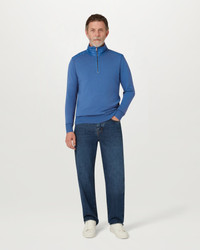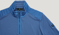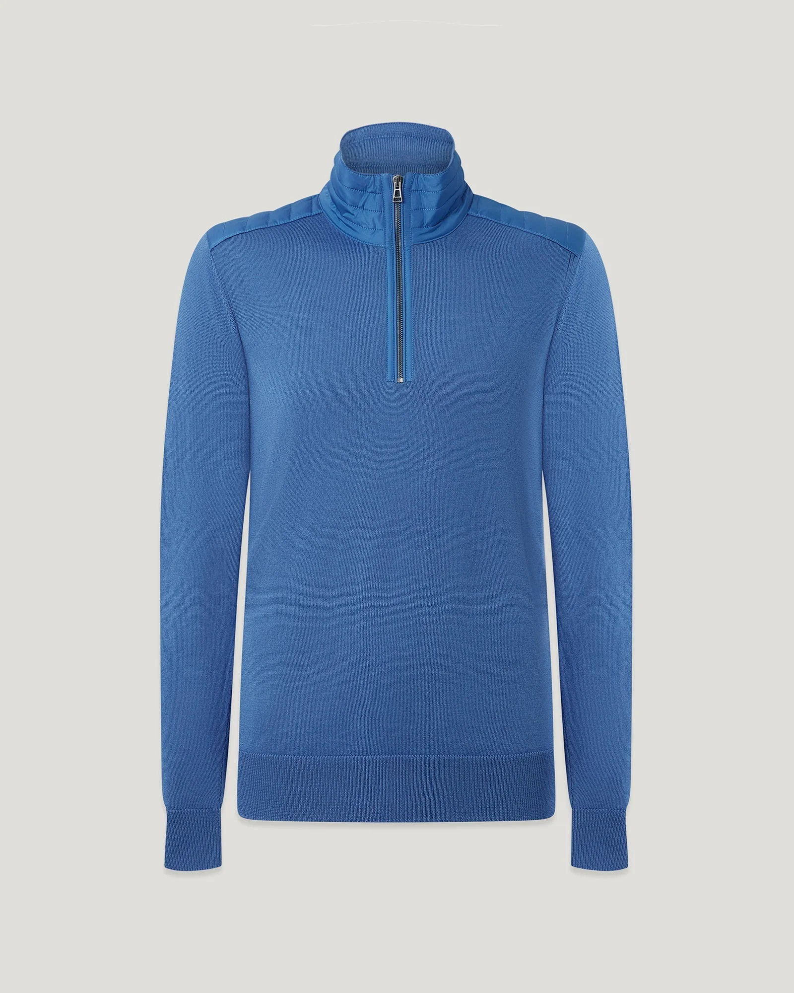 The Kilmington quarter-zip jumper in Marine Blue is a mixed-media fabrication in soft extra-fine black merino wool with textural nylon quilting. The contrast shoulder panels provide a structural element to this easy, go-to style. DETAILS - Extra-fine merino - Soft extra fine merino wool with textural nylon quilting detail at collar and shoulder - Contrast shoulder panels provide a structural element and military feel - Belstaff phoenix patch on left sleeve - Centre front quarter zip fastening - Non-mulesed wool, recycled polyester contrast - Body: 100% Extra-fine merino wool Woven: 100% Recycled polyester Filling: 100% Recycled polyester - Made in China - Dyed in China - Product ref: 105599MRNBL SIZE AND FIT - Cut for a slim fit - Model wears a size L - Model measures : Height: 6'1", Chest: 40", Waist: 31"