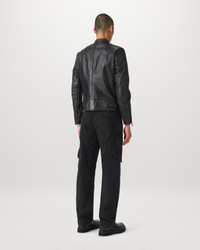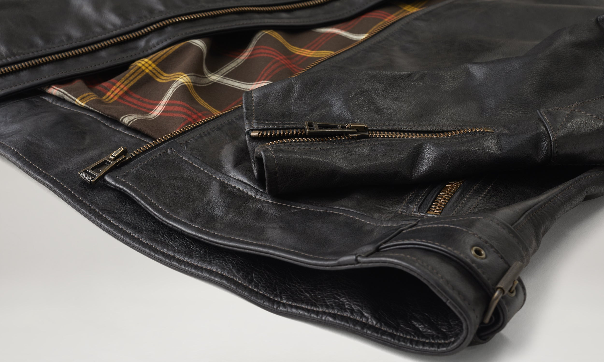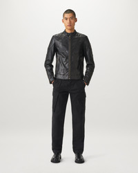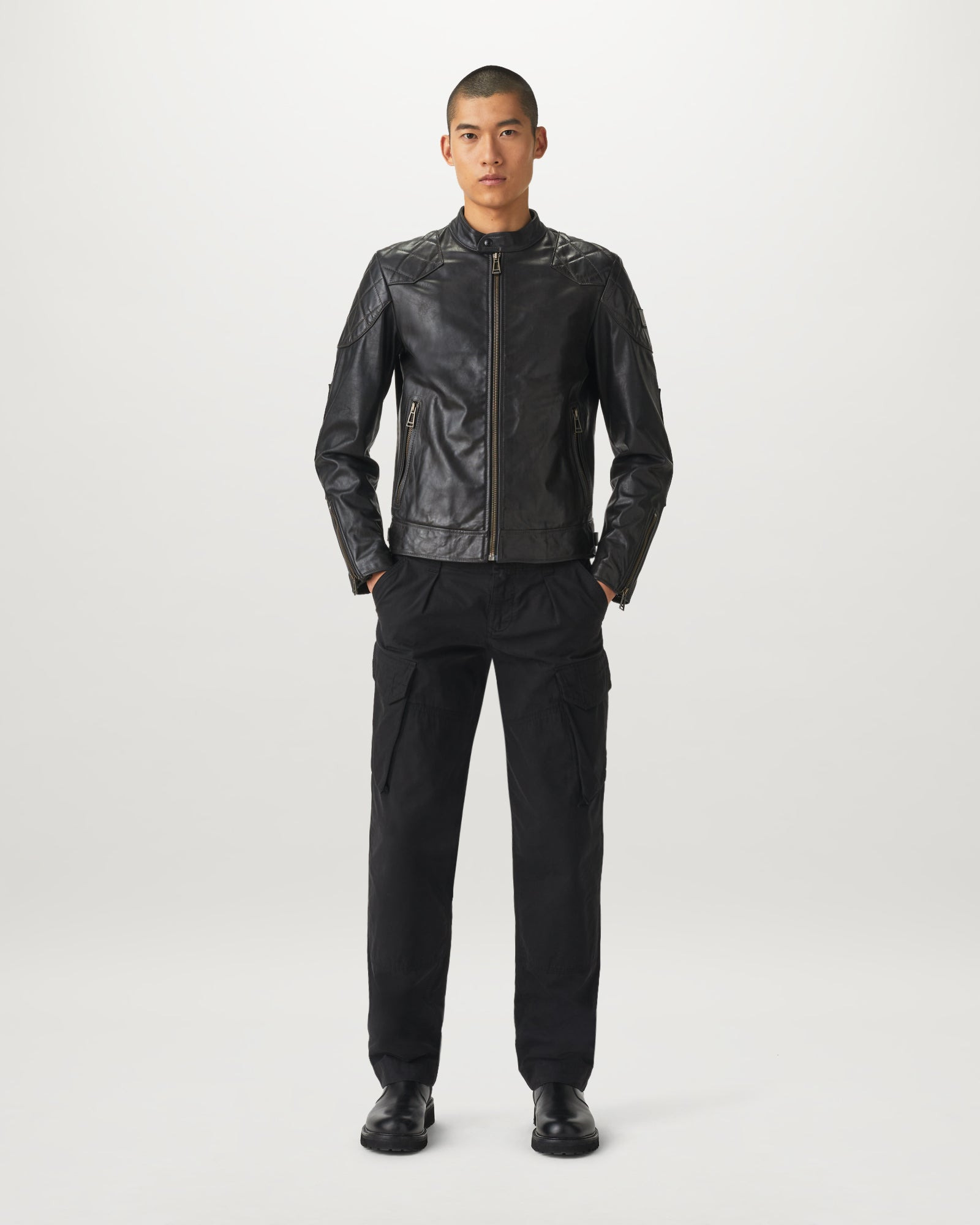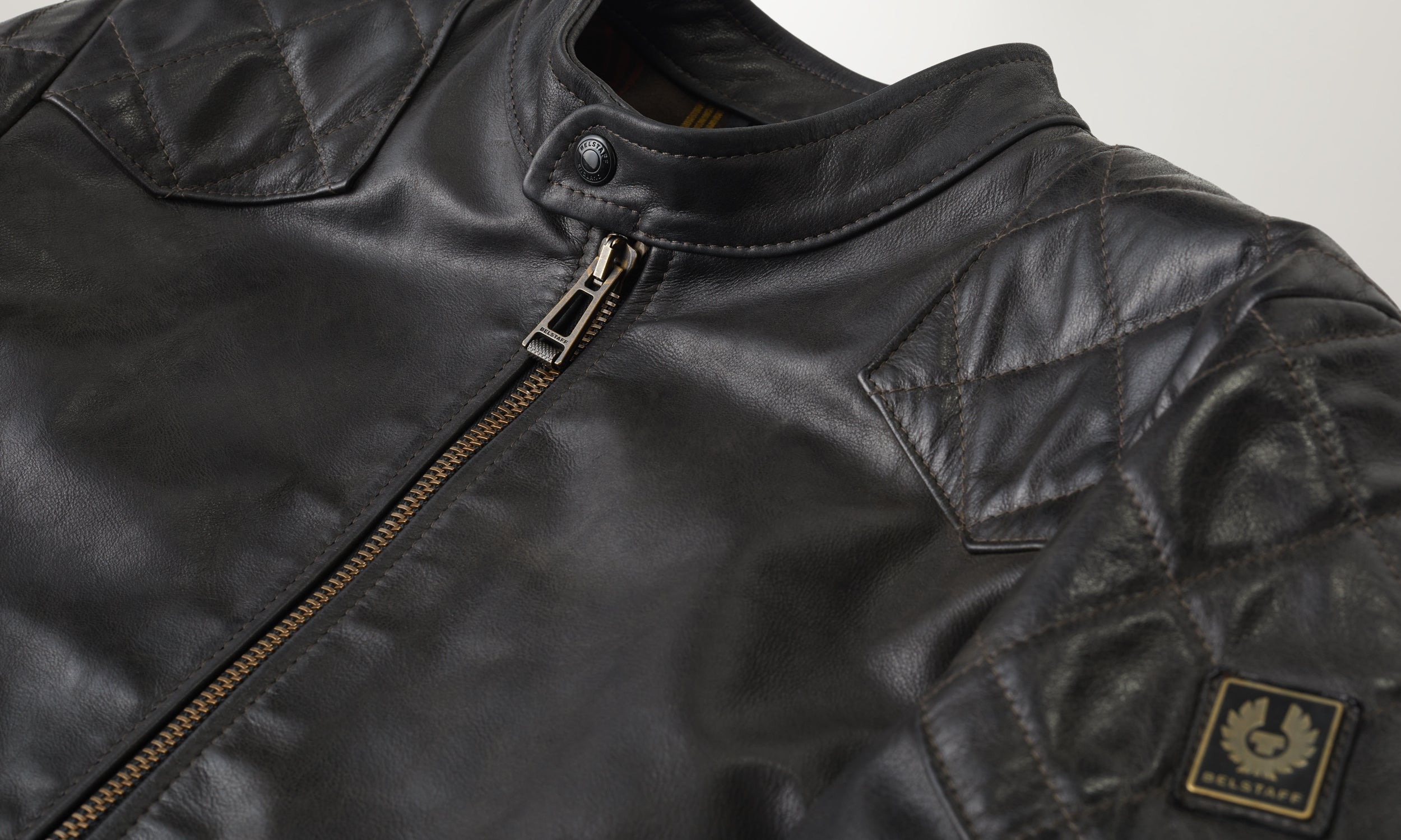 The Legacy Outlaw Jacket. A hand-waxed leather, washed and treated for a worn effect give this piece an assertive edge. A classic biker style that will age beautifully. Belstaff`s leather products support responsible manufacturing via the Leather Working Group. DETAILS - Hand-waxed leather, washed and treated for a worn effect - Patina will darken with age - Café-racer jacket - Archival check lining - Café racer-style collar with snap button fastening - Centre front zip fastening - Two side zip pockets - Metal plaque on sleeve - Shell: 100% Cow leather, Body lining: 100% Cotton, Sleeve lining: 100% Viscose/Rayon - Product ref: 104619ATBLK SIZE AND FIT - Cut for a slim fit - Model wears a size 48 - Model measures: Height: 6'3", Chest: 37", Waist: 32"