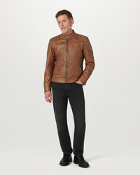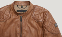 The Legacy Outlaw jacket in Cork. Hand-waxed leather – washed and treated for a worn effect – gives this piece an assertive edge. The waxing process increases the leather’s durability while providing a smooth and supple finish. This is a classic biker style that will age beautifully. DETAILS - Hand-waxed leather, washed and treated for a worn effect - Patina will darken with age - Cafe-racer jacket - Archival check lining - Cafe racer-style collar with snap button fastening - Centre front zip fastening - Two side zip pockets - Metal plaque on sleeve - Shell: 100% Cow leather, Body lining: 100% Cotton, Sleeve lining: 100% Viscose/Rayon - Made in Italy - Product ref: 104619CORK SIZE AND FIT - Cut for a slim fit - Model wears a size US 38 - Model measures : Height: 6'1", Chest: 40", Waist: 31"